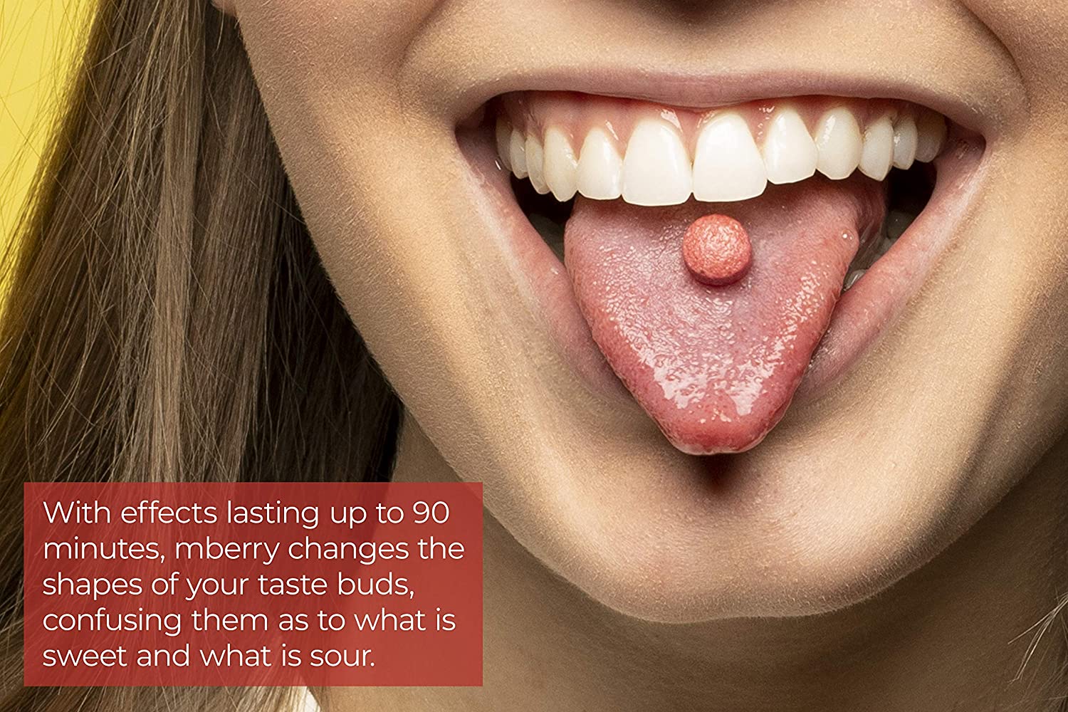 MBERRY MIRACLE FRUIT TABLET - The new indulgence is practically magic! Turn sour food sweet by inhibiting your taste receptors. Truly transform foods you never thought could be so sweet and delicious. PERFECT FOR - Explore the many ways to use mberry tablets. Host “flavor-tripping” dinner parties or get your kids to eat their vegetables. Make hot sauce taste like hot donut glaze, lemons taste like lemonade, and much more. ON THE GO - These miracle berry flavor change pills come in a convenient on-the-go packaging that preserves its Miraculin properties. Take with you wherever you go, suitable for all ages. COMPLETELY NATURAL - These miracle berry tablets are hand-picked fruit and 100% natural and authentic, with no added sugar, colorants, or cheap fillers. INCLUDES - Enjoy these flavor tripping fruits when exploring new foods. This portable package includes 10 tablets per packet, sourced with the highest quality miracle fruit.