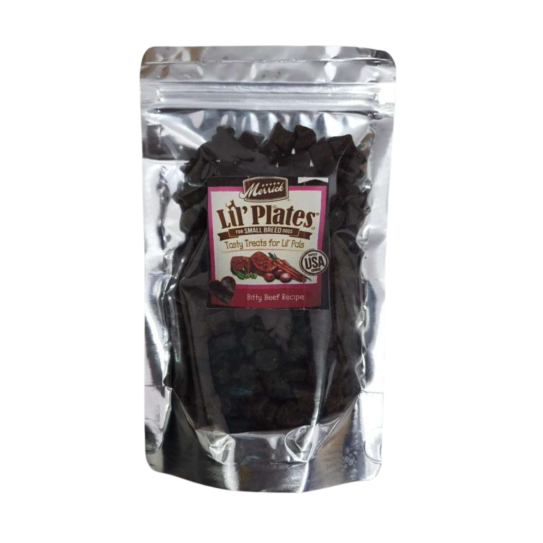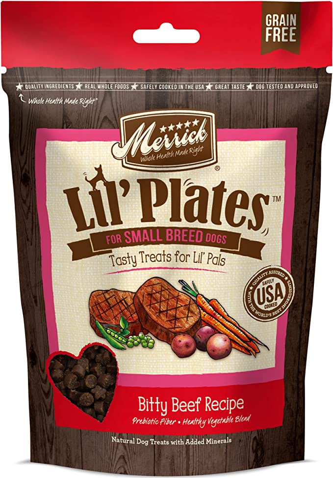 Merrick Lil' Plates Bitty Beef Recipe Grain Free Small Breed Dog Treats are big on flavor and protein, but small in size for your dog's tiny mouth. The number one ingredient in these Merrick dog treats is always real deboned beef, plus a whole load of wholesome vegetables. Formulated specifically for small breed dogs, these natural, healthy dog treats come in a number of fun shapes, all of which are perfectly sized for smaller breeds. Crafted with prebiotic fiber for optimal digestion, these adult dog treats are also crafted with Omega fatty acids, making them the ideal dog treats for skin and coat health support. These soft dog treats contain no artificial flavors, colors or preservatives. Each of these beef dog treats are also grain free and gluten free for a treat your dog is sure to love.