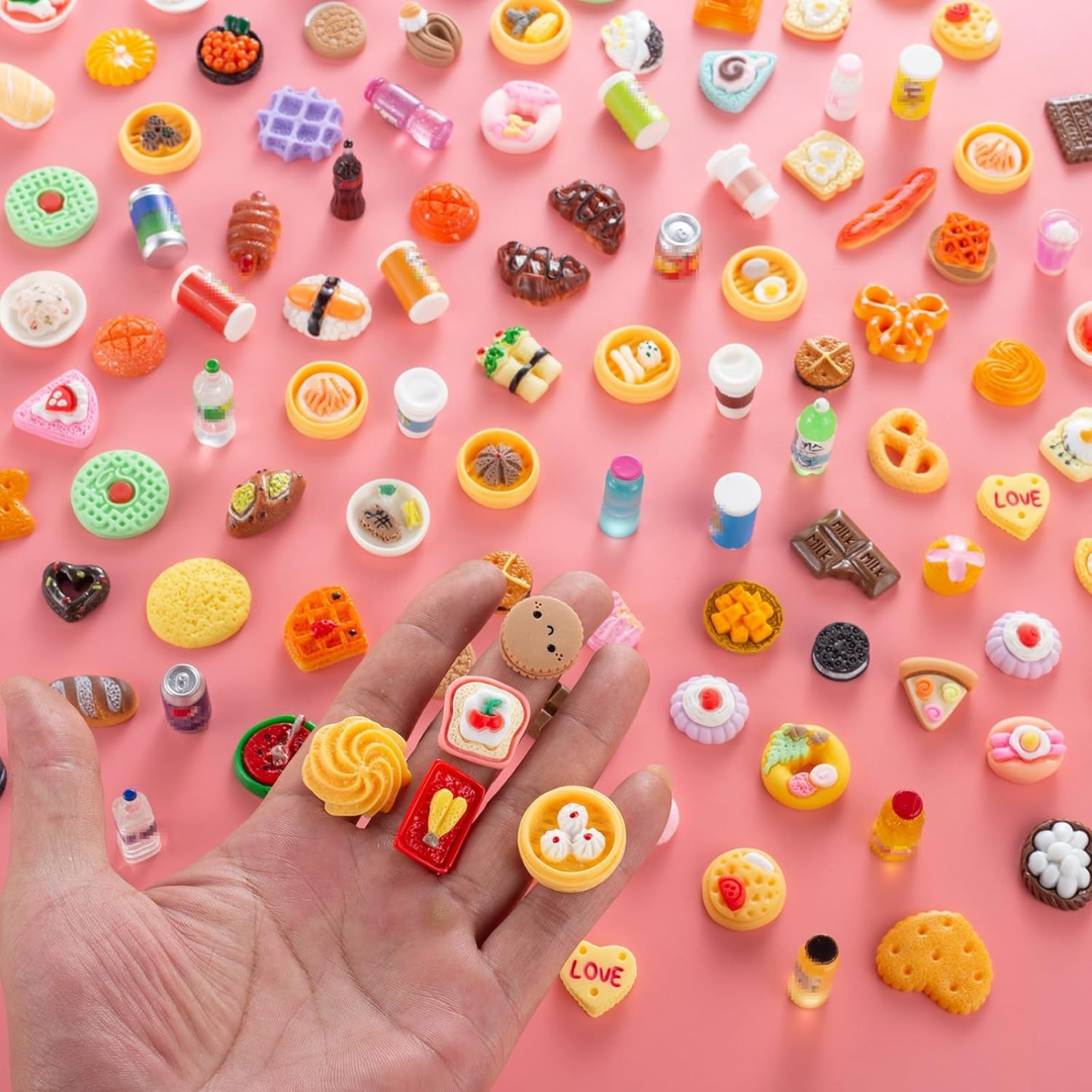 Includes 2 toy shopping carts (red & blue), 2 baskets, 1 dollhouse refrigerator, 1 cash register, 1 shelf, 100 miniature food pieces, 50 micro bottles, 1 pack of ice cubes, and 6 bundles of paper currency. Made with metal carts, plastic furniture, and resin food pieces for durability and realistic look. Ideal for dollhouse play, pretend play, role play, DIY crafts, and miniature gardens. Mini carts feature rolling wheels and foldable seats. Small parts; not for children under 3.