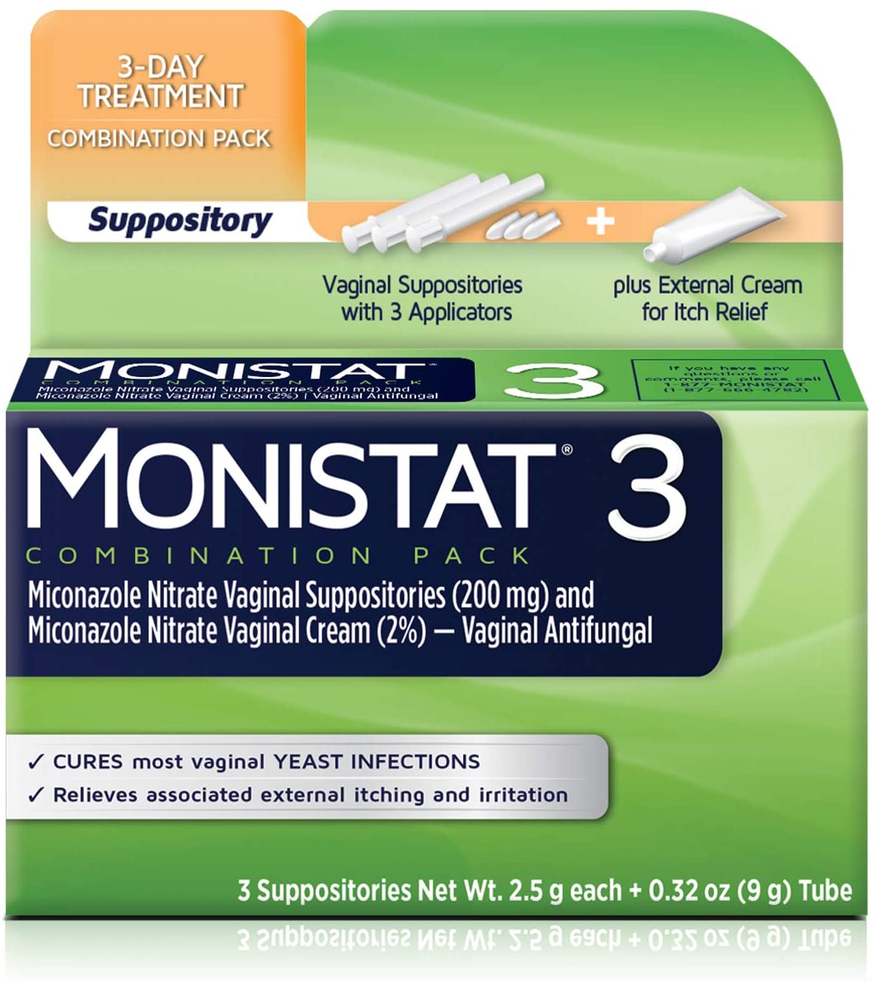 Monistat 3 Day Yeast Infection Treatment is a great option for women who want a less concentrated treatment at moderate dosage levels. This package contains three vaginal suppositories plus one tube of external cream for itch relief. Monistat is the #1 Doctor and Gynecologist Recommended over the counter (OTC) yeast infection brand and starts working right at the site of infection. If you do not feel some relief within 3 days, or complete relief within 7 days, stop using the product and consult your healthcare professional. Monistat treats five out of the five most common types of yeast infections and relieves symptoms four times faster than the leading prescription pill.