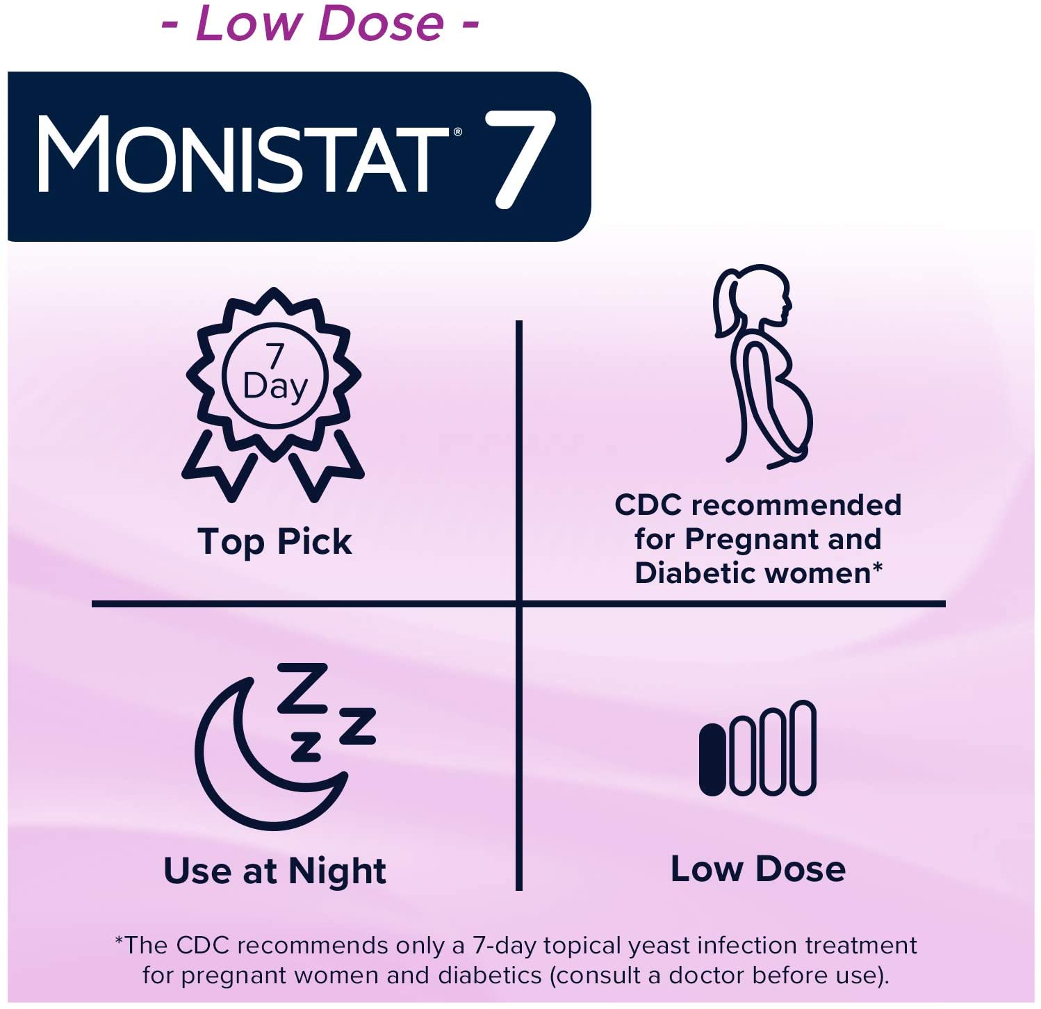 The Monistat 7 suite of products is a low dose formula with smaller doses of the active ingredient evenly distributed throughout the week at bedtime. The CDC recommends only a 7 day topical yeast infection treatment for pregnant women and diabetics (consult a doctor before use). This package contains seven applicators with cream.