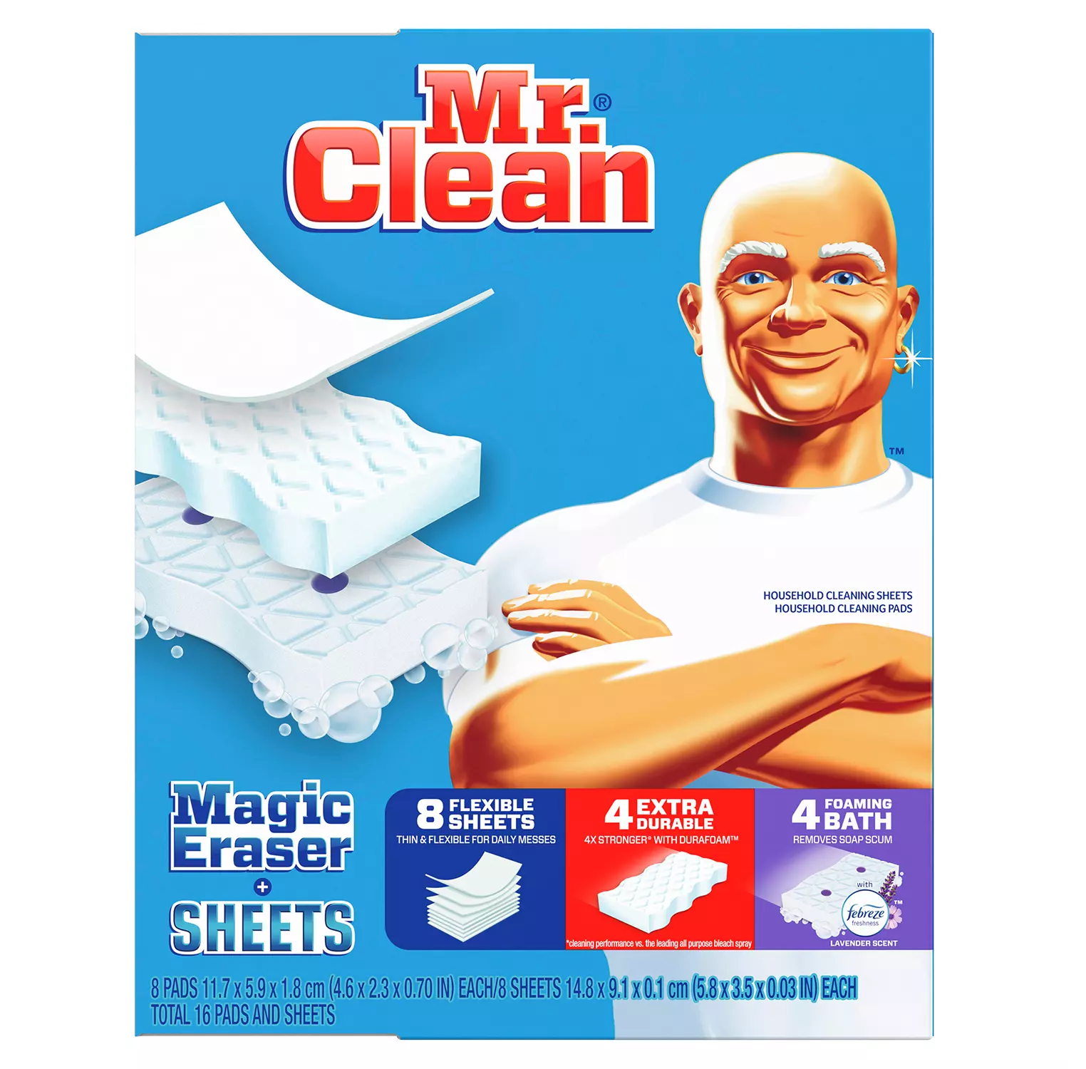 This variety pack includes Mr. Clean Magic Eraser Extra Durable scrubber, foaming bath scrubber, and individual sheets. Together, these three multi-purpose cleaning pads are perfect for your impossible messes all around the house: marks on walls, stubborn bathroom soap scum and baked-on kitchen messes. Magic Eraser Extra Durable Sponges. When life gets messy, get the Magic Eraser Extra Durable with Dura foam. It has a 4x stronger cleaning performance than the leading all-purpose bleach spray, so it tackles your home’s most impossible dirt with ease. Magic Eraser Foaming Bath Sponges with Febreze Lavender Scent. Mr. Clean Magic Eraser Bath scrubber, with Febreze Lavender Scent, erases 3x more soap scum*. The build-up of tough soap scum on your sink, shower and tub can quickly transform your bathroom from shiny and clean to dingy and grimy. The cleaning scrubber is more durable than Mr. Clean Magic Eraser Original, allowing you to tackle your tough bathroom messes easily.
