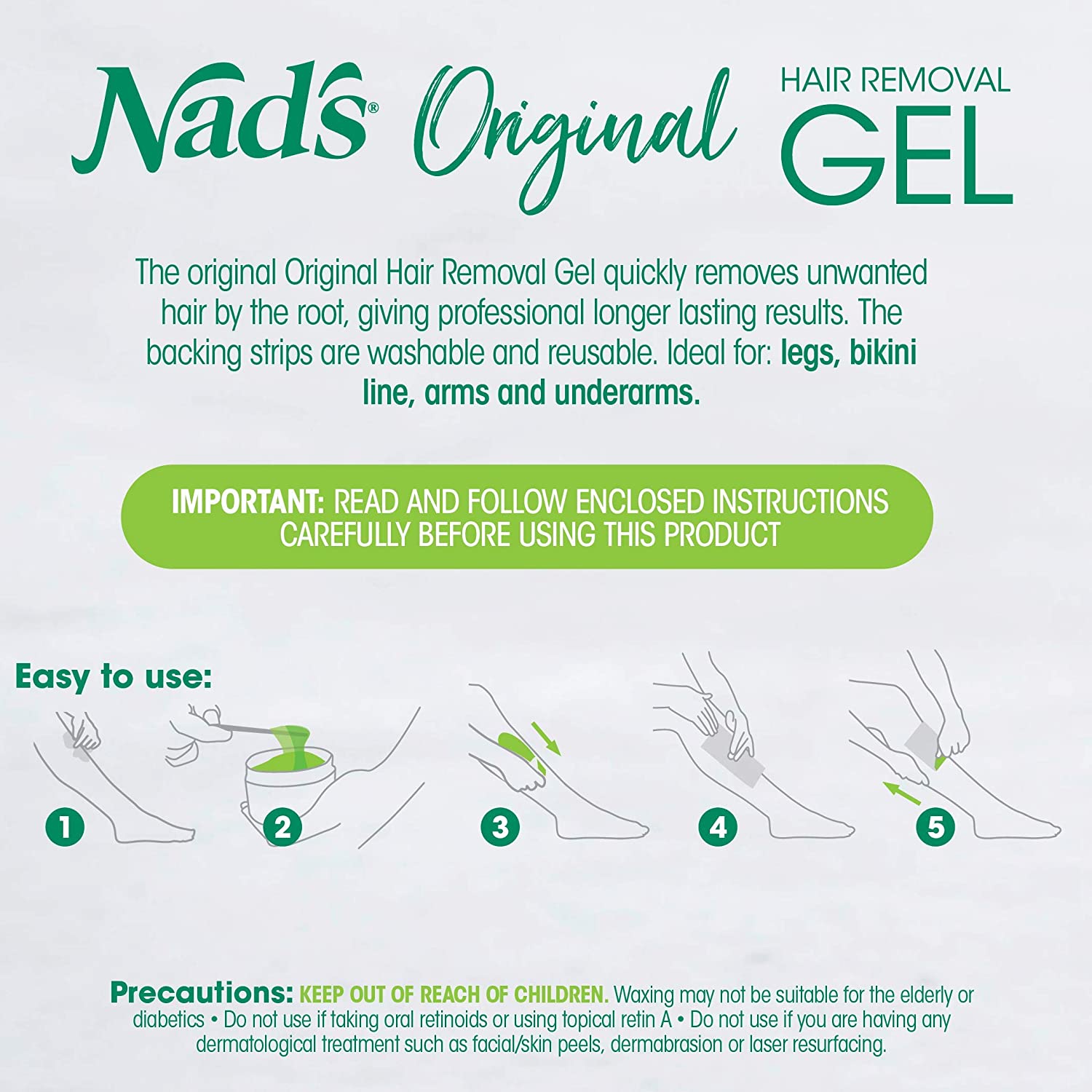 - Kit contains: 1 Nad’s Natural Hair Removal Gel 170g (6oz), 4 Nad’s Pre Wax Cleansing Wipes, 6 Spatulas, 100% Premium Cotton Strips, 1 Moisture + Soothing Body Balm 15g (0.53oz), instruction leaflet