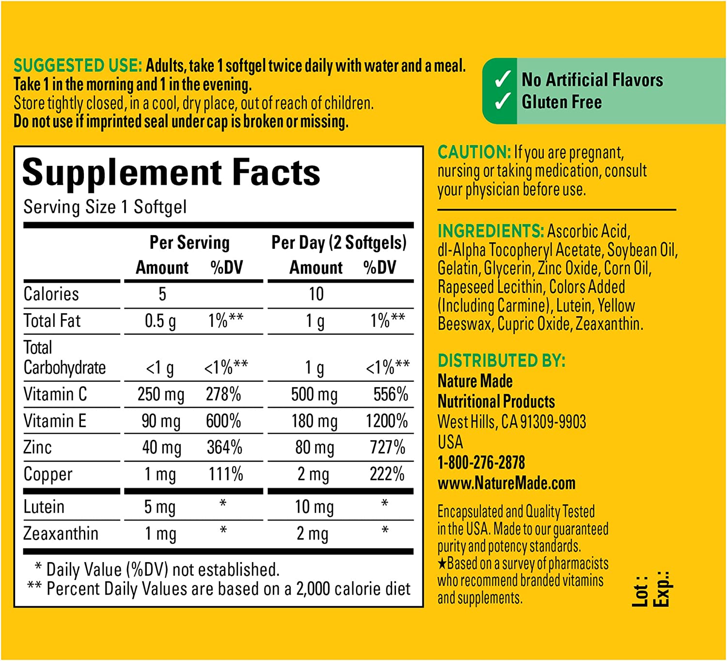 Nature Made Vision based on the AREDS 2 Formula Softgels are dietary supplements that provide key eye vitamins and nutrients to help support healthy vision and eye function. Sourced from high-quality ingredients, these eye supplements for adults contain no artificial flavors and are gluten free. The eyes need support just like every other part of the body, and this Nature Made vision supplement based on the AREDS2 Formula combines carotenoids and antioxidants to support your eye health.