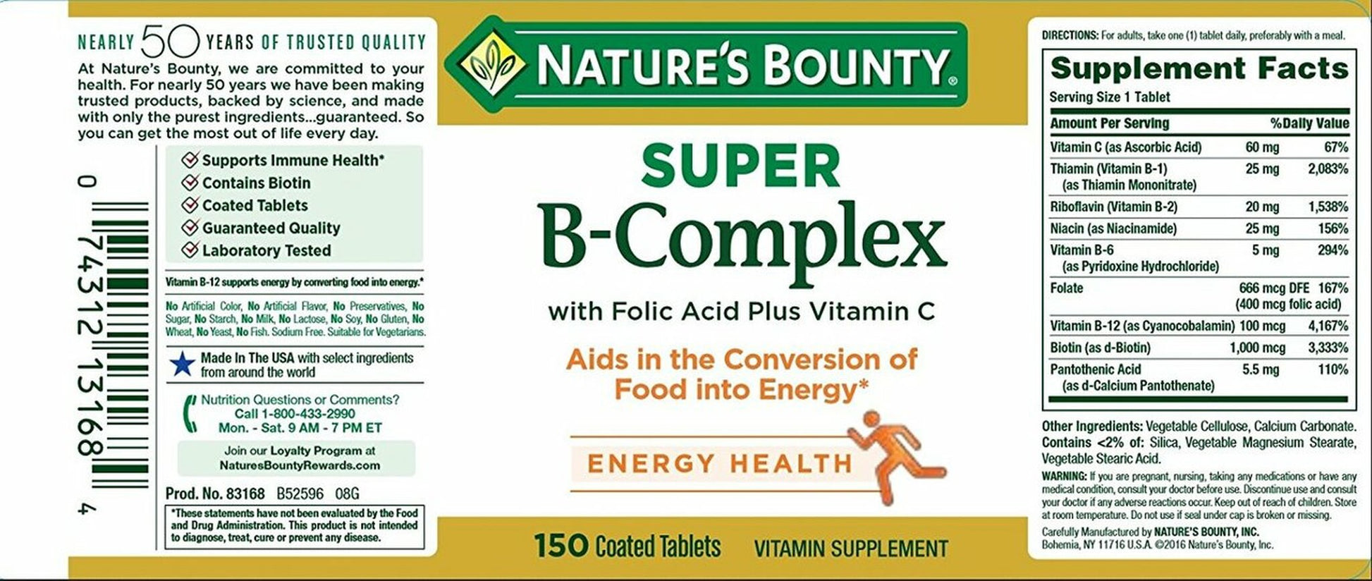 Nature's Bounty Super B-Vitamin Complex with Folic Acid Plus Vitamin C is made up of several vitamins that work well together to support heart and nervous system health while providing nourishment for the occasional stress of daily living.* A vital vitamin for women during pregnancy, folic acid supports reproductive health and the health of developing children.* Just one high-potency tablet a day includes a variety of B vitamins, plus Vitamin C for heart, immune, and antioxidant support.