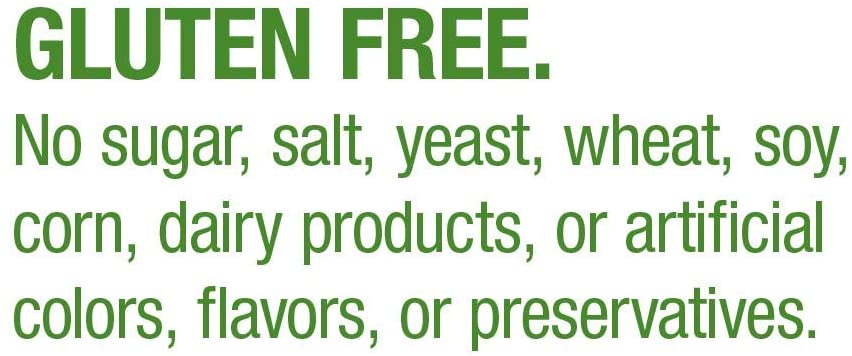 - GLUTEN-FREE AND VEGETARIAN: Contains no sugar, salt, yeast, wheat, soy, corn, dairy products, artificial colors, flavors or preservatives.