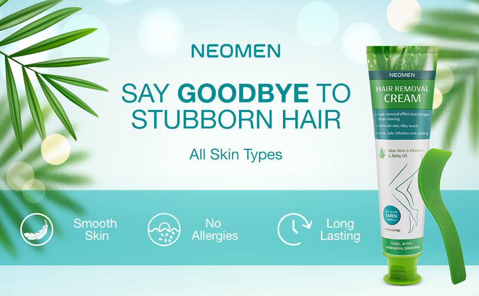 NEOMEN skin friendly painless flawless premium depilatory cream for women and men, which consists of safe ingredients including Aloe Vera, Vitamin E, Olive Oil, suitable for any skin type, and leaving your skin smooth. Free of allergies and strawberry spots. Please enjoy your safe, effective, gentle and long-lasting hair removal cream at Neomen