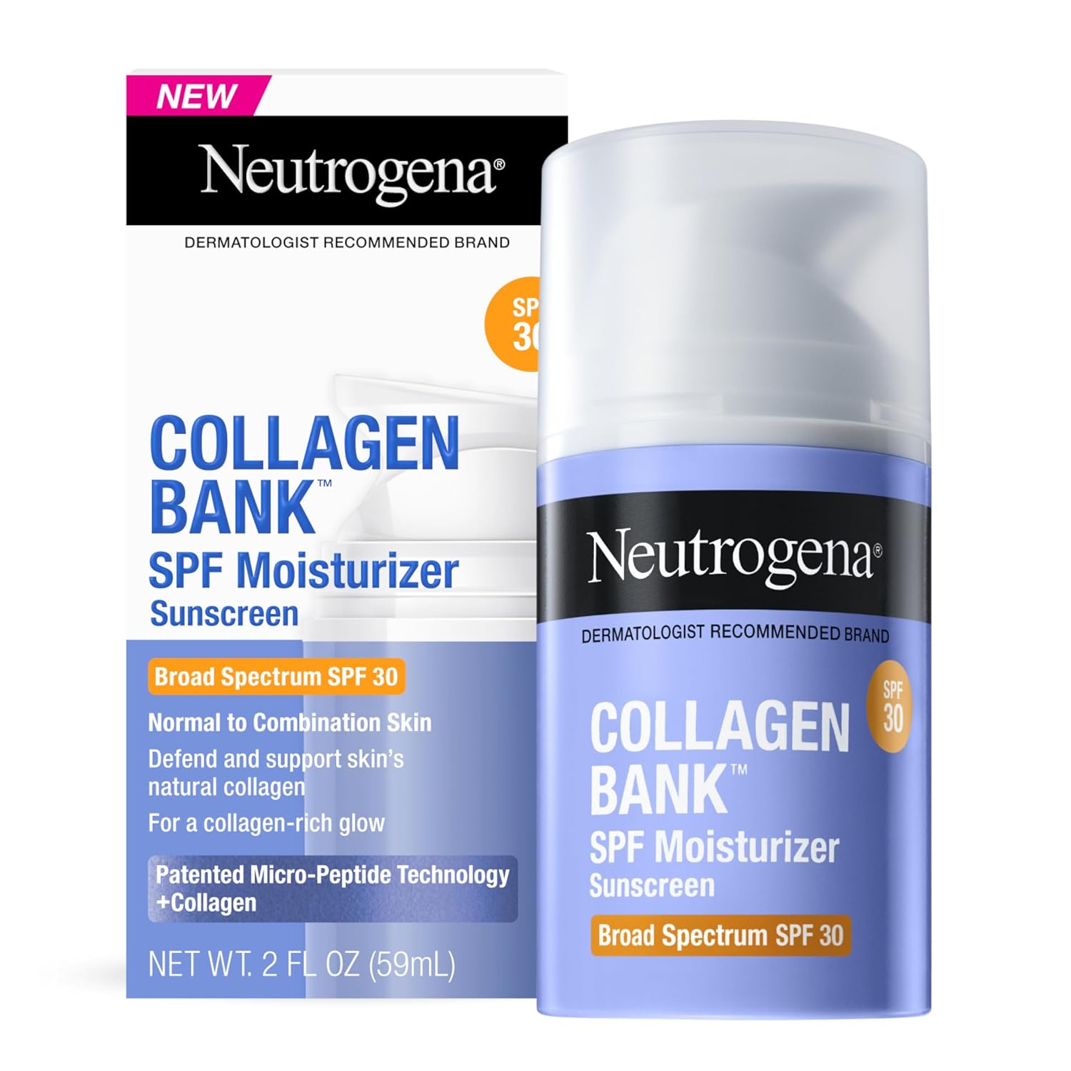Starting in your 20's you lose up to 1% of collagen each year. Skin’s natural collagen is vital for youthful looking skin. Strengthen the collagen you have, build the collagen you don’t with NEW Neutrogena Collagen Bank SPF 30 Facial Moisturizer. This anti-aging face cream is boosted with a patented micro-peptide technology developed with dermatologists. The micro-peptide is 2x smaller than leading anti-aging peptides, which only sit on top of skin, to penetrate more than 10 layers** deep to support collagen. Clinically proven to improve early signs of collagen decline*. With broad spectrum SPF 30, it defends against the sun, the #1 collagen depleting aggressor. Melts into skin with an invisible finish on all skin tones & won't clog pores. Gentle for daily use & suitable for all skin types including acne prone & sensitive skin. Add Collagen Bank SPF 30 Anti-Aging Face Cream from Neutrogena, a dermatologist-recommended brand, to your skincare routine for stronger collagen & plumper skin.