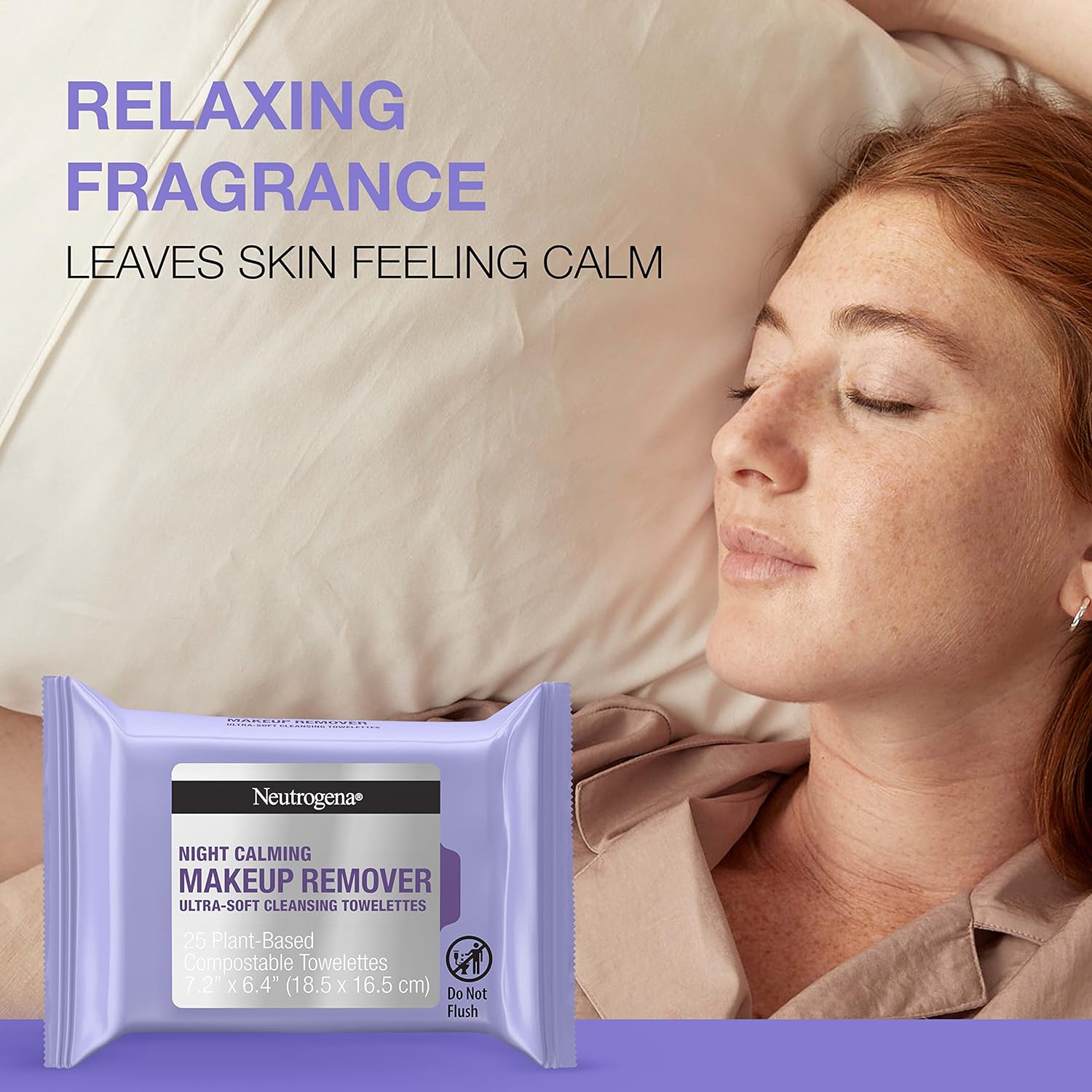 Gently remove makeup & cleanse the day away with Neutrogena Makeup Remover Night Calming Cleansing Face Wipes with a relaxing scent. The nighttime facial cleansing towelettes gently dissolve up to 99% of makeup, even waterproof mascara. Plus, these face wipes lift away oil, dirt, sunscreen & pollution while the relaxing scent calms you before bed. The patented cleansing technology of these pre-moistened facial cleansing towelettes with a triple emollient blend melts away makeup & leaves skin refreshingly clean with no heavy residue. Ophthalmologist and dermatologist tested, these hypoallergenic cleansing cloths are formulated without parabens, alcohol, sulfates, phthalates, soaps & dyes & are gentle enough even for the delicate eye area. Designed with the Earth in mind, use these 100% plant-based cloth daily face wipes for effortless cleansing made gentle & compostable.