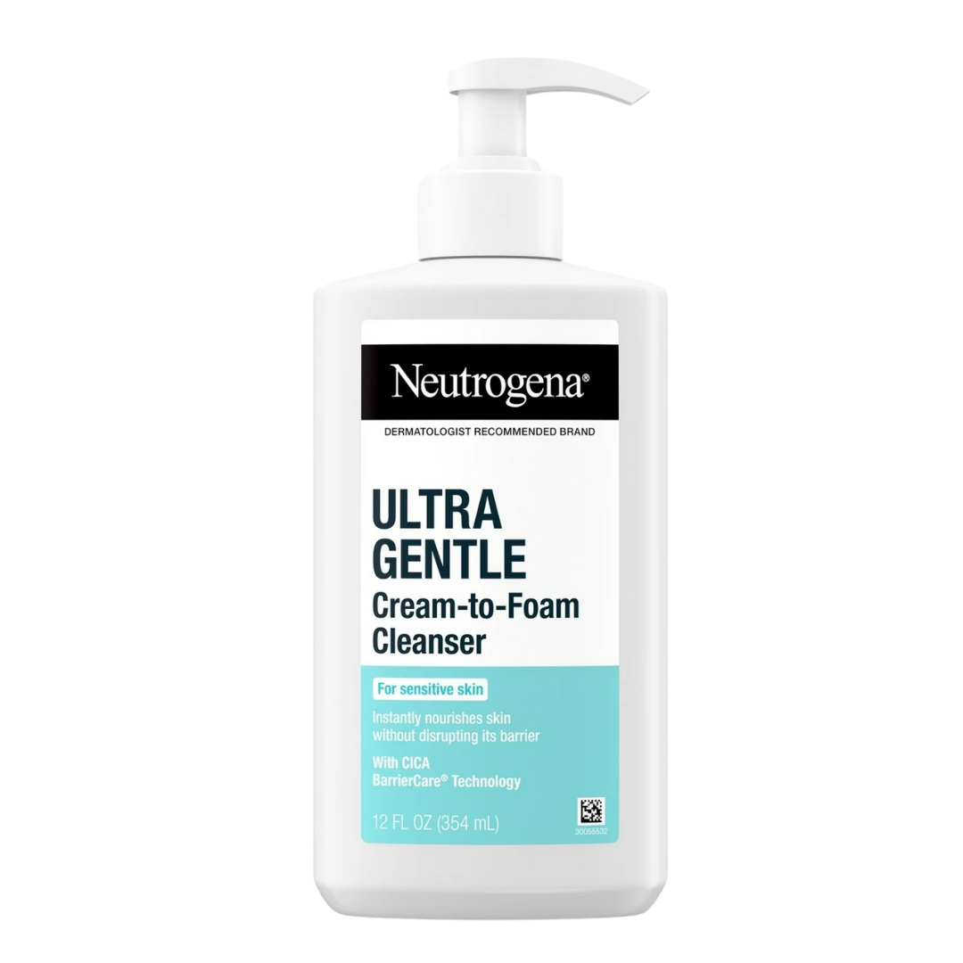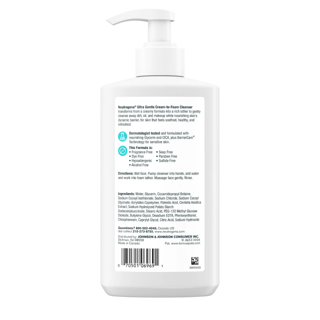 Neutrogena Ultra Gentle Cream-to-Foam Cleanser gently removes dirt, oil, and makeup while nourishing sensitive skin. With glycerin, cica, and BarrierCare Technology, it transforms from a cream to a rich foam without disrupting your skin's moisture barrier. Fragrance-free and dermatologist-tested.