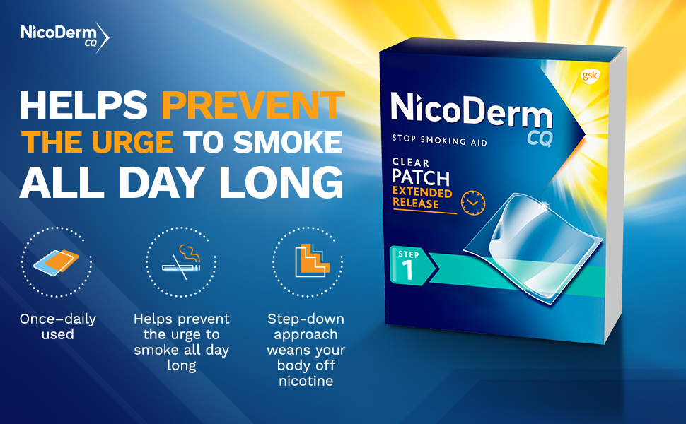 NicoDerm CQ Step 1 Nicotin Patches to Quit Smoking are low-maintenance stop smoking aids that help you adjust to life as a non-smo-ker. Made with Extended Release SmartControl Technology, these smo-king cessation patches release a steady flow of therapeutic nicotin that is absorbed through the skin for 16 to 24 hours, ensuring it won't run out too soon or be delivered all at once. Discreet and easy to apply, these quit smo-king products stick to your skin like an adhesive bandage, preventing the urge to smo-ke and relieving the anxiety, frustration, irritability and restlessness associated with quitting smo-king. If you smo-ke more than 10 cigs a day, increase your chances of success by starting with these 21 mg nicotin patches, and complete the 10-week quit program with behavioral support. Take control of your quit with NicoDerm CQ Step 1 Nicotin Patches to Quit Smo-king.