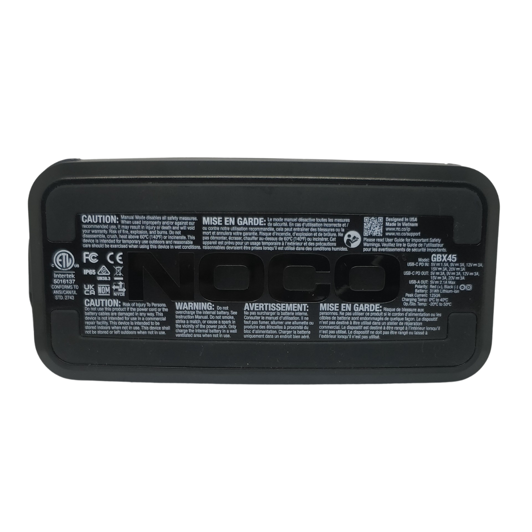 The Noco Boost X GBX45 is a powerful 12V jump starter and portable power bank designed to start dead batteries in seconds. With a peak current of 1250A, it supports gas and diesel engines, making it ideal for cars, motorcycles, boats, and more. Built with advanced safety technology, it protects against reverse polarity, sparks, and overcharging. This unit has a minor LED indicator issue that does not affect core performance. Compact, durable, and USB-C compatible, the GBX45 is a reliable tool for emergencies and everyday use. Size: GBX45.
