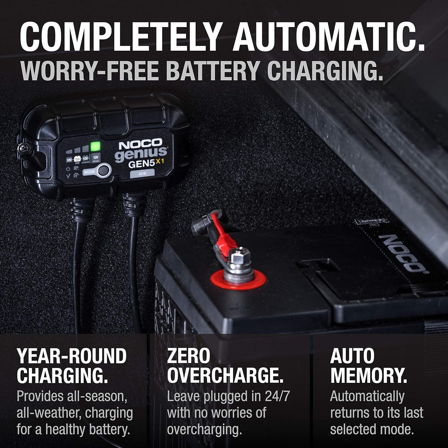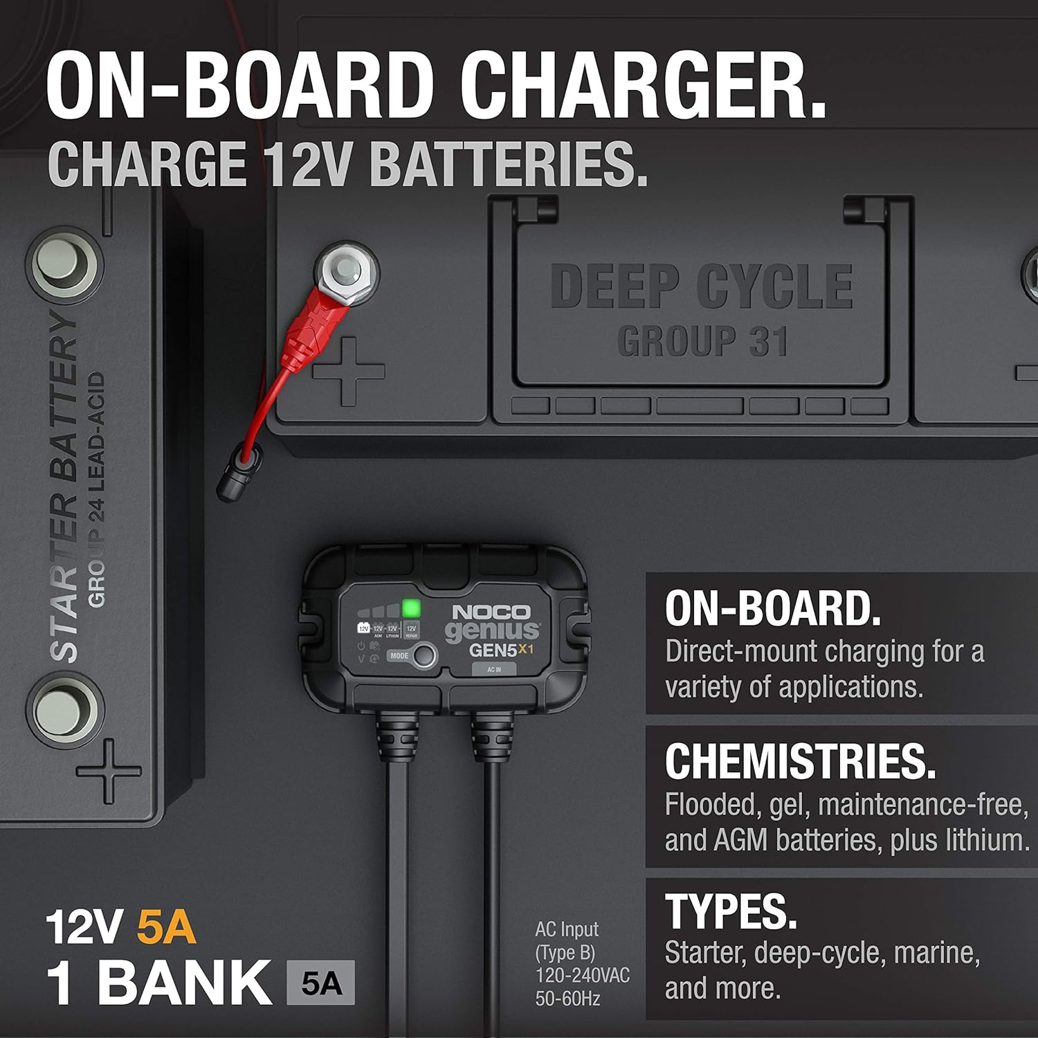 Meet the GEN5X1 - Similar to our GENM1, only better. It's 37% smaller and delivers 43% more power. It's one of the best performing onboard marine battery chargers we have ever made. Multiple banks - A one-bank onboard battery charger rated a 5-amps - 5-amps per bank - for 12-volt batteries, including marine, boat, starter, and deep-cycle batteries. Charging modes - Independently charge and control each battery bank with selectable charging modes - including 12V, 12V AGM, 12V Lithium, and 12V Repair Mode - for all types of lead-acid and lithium-ion batteries. Enjoy precision charging - An integrated thermal sensor detects the ambient temperature and alters the charge to eliminate over-charging in hot climates and under-charging in cold climates. Charge dead batteries - Charges batteries as low as 1-volt. Or use the all-new force mode that allows you to take control and manually begin charging dead batteries down to zero volts. Redefined mounting - A simplified mounting system allows for quick and easy installations in any direction - even up-side-down - with an integrated anti-vibration backing to isolate shock, vibration, and noise. Designed for water - A fully-sealed and waterproof onboard battery charger with an ingress protection rating of IP68, but has survived brutal life cycle testing, including thousands of hours underwater. What's in the box - GEN5X1 5-amp 1-bank waterproof onboard marine battery chargers (120-240VAC) with a 72-Inch DC cables with 3/8-inch eyelets and a 72-inch Type-B AC cable, (2) self-tapping mounting screws, user guide, and 3-year warranty.
