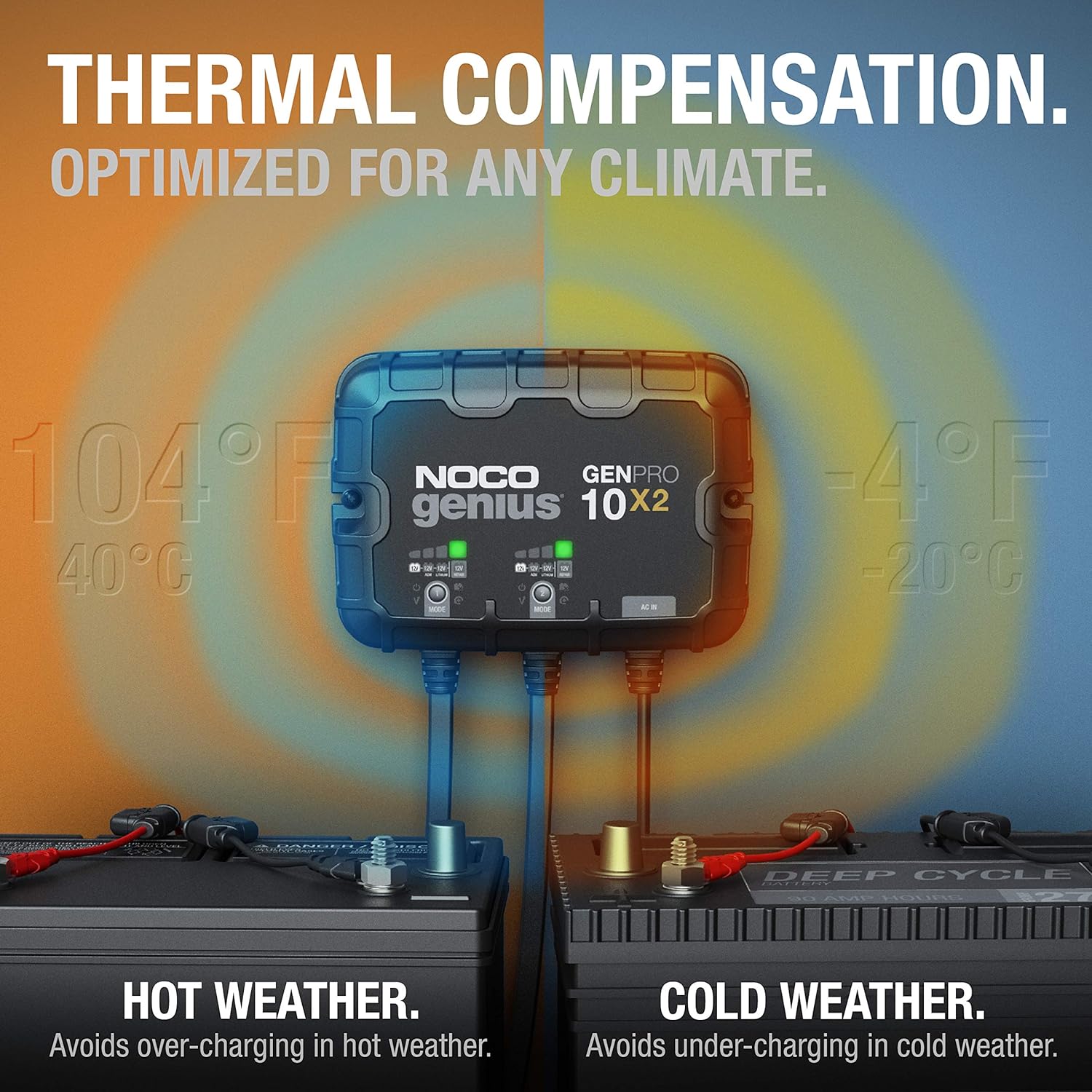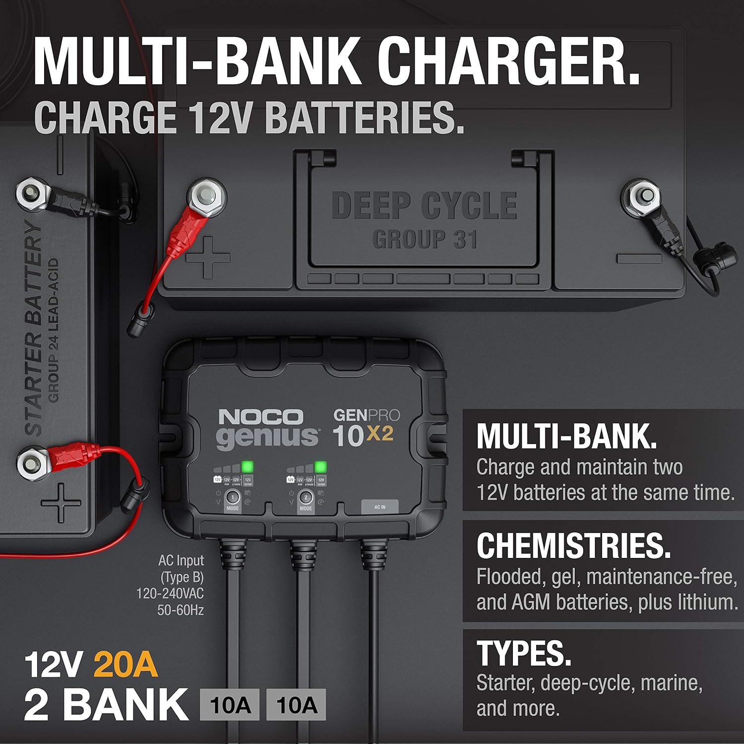 Introducing the GENPRO10X2, our most rugged, compact, and powerful, onboard marine battery charger we have ever made. The GENPRO10X2 is designed to charge and maintain up to two (2) 12-volt lead-acid and lithium-ion batteries, including flooded, gel, AGM, and deep-cycle batteries. Each 12-volt battery bank provides up to 10-amps of pure charging power, plus doubles as a battery maintainer and battery desulfator. Included is a GENPRO10X2 20-Amp 2-Bank Waterproof Onboard Marine Battery Chargers (120-240VAC), Self-Tapping Mounting Screws, User Guide, 3-Year Warranty and certified to UL1236, ISO 8846, and 33 CFR 183.410.