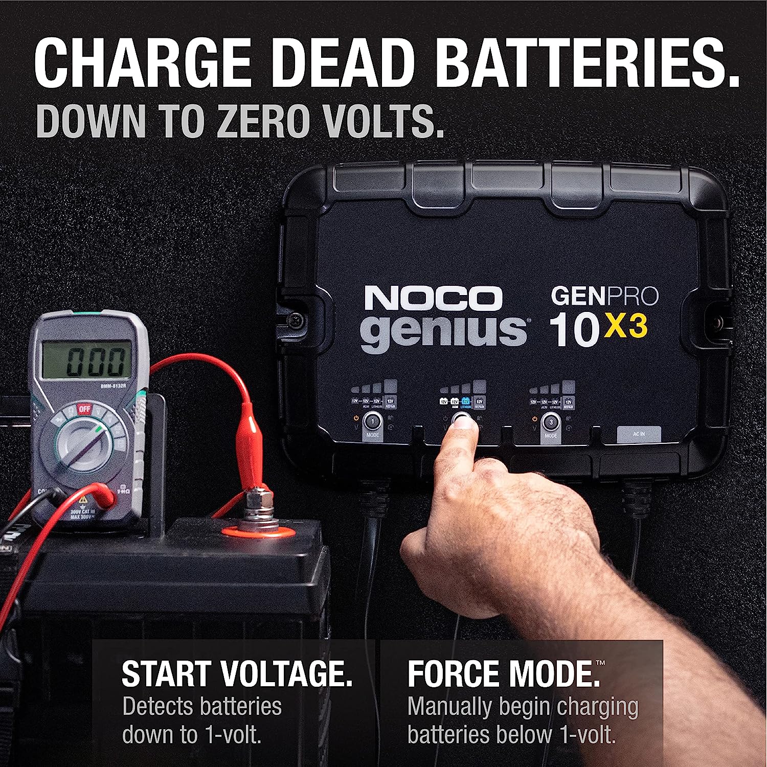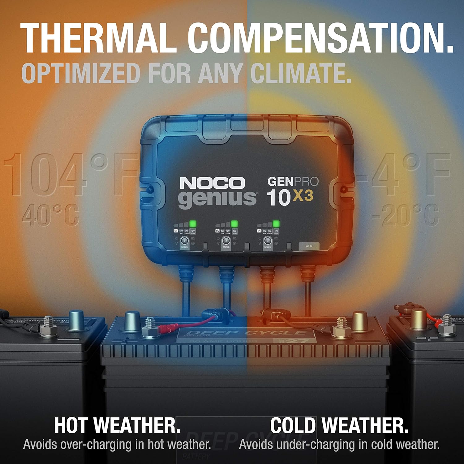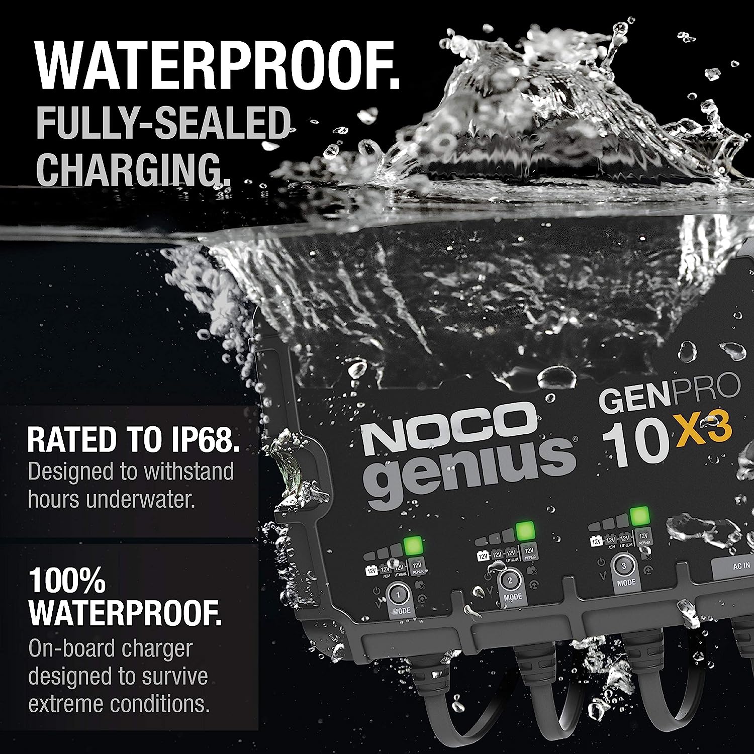 Introducing the GENPRO10X3, our most rugged, compact, and powerful, onboard marine battery charger we have ever made. The GENPRO10X3 is designed to charge and maintain up to three (3) 12-volt lead-acid and lithium-ion batteries, including flooded, gel, AGM, and deep-cycle batteries. Each 12-volt battery bank provides up to 10-amps of pure charging power, plus doubles as a battery maintainer and battery desulfator. Included is a GENPRO10X3 30-Amp 3-Bank Waterproof Onboard Marine Battery Chargers (120-240VAC), Self-Tapping Mounting Screws, User Guide, 3-Year Warranty and certified to UL1236, ISO 8846, and 33 CFR 183.410.