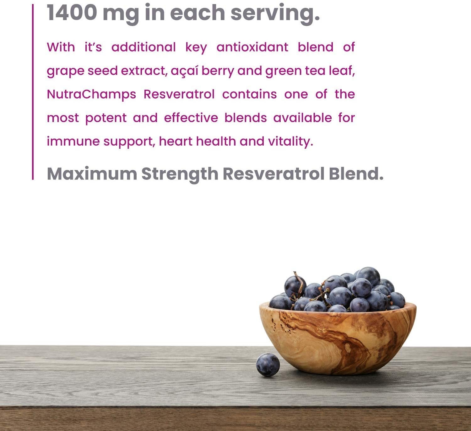 NutraChamps Resveratrol 1400 is made in the USA with premium ingredients, offering unmatched potency at 1400 mg per pill. It supports vitality, energy, and immune health with added antioxidants like Grape Seed, Green Tea, and Acai Berry. Vegan, non-GMO, gluten-free, and free of artificial fillers.