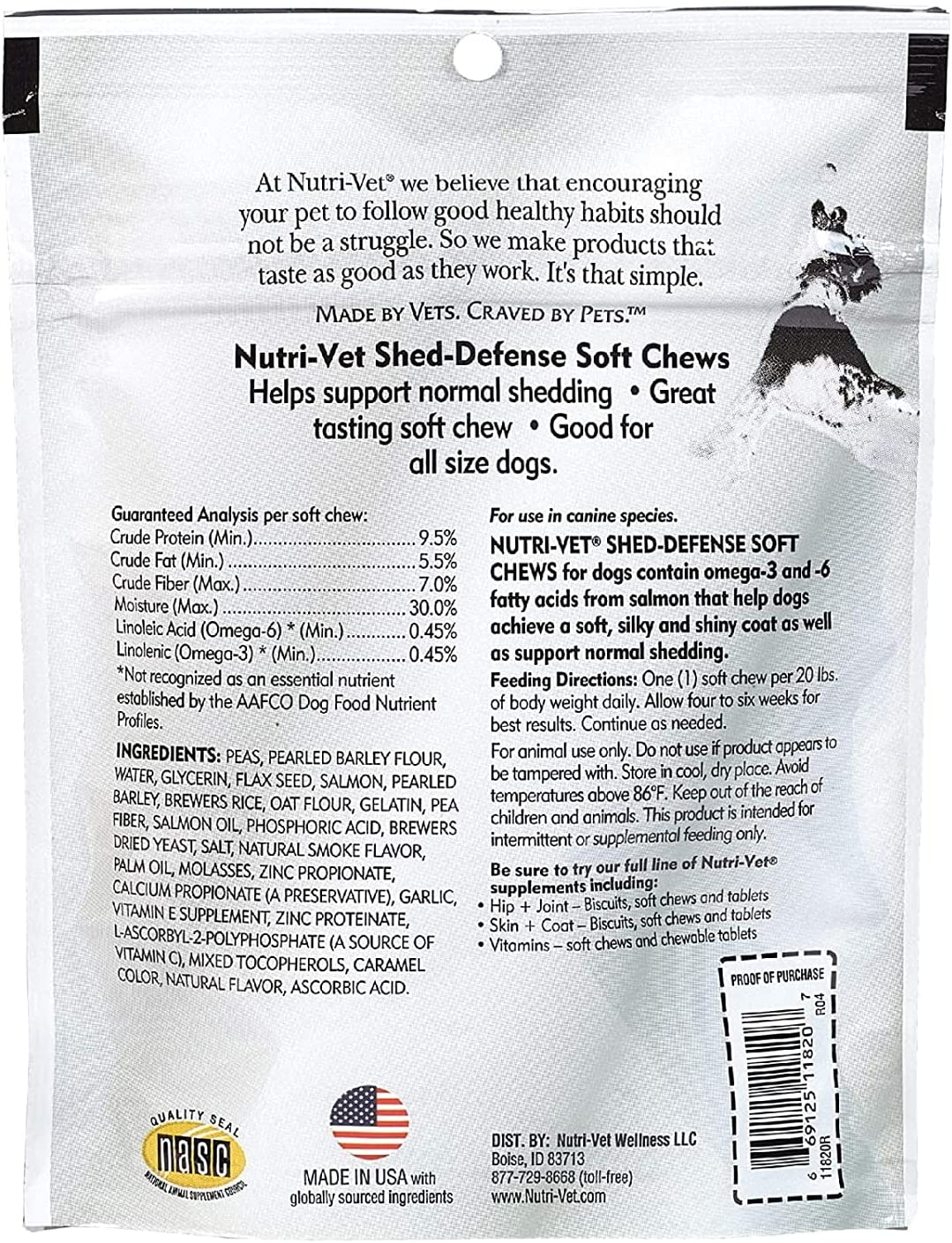 Nutri-Vet Shed-Defense Soft Chews contain omega-3 and omega-6 fatty acids from salmon that promote skin and coat andnormal shedding.
