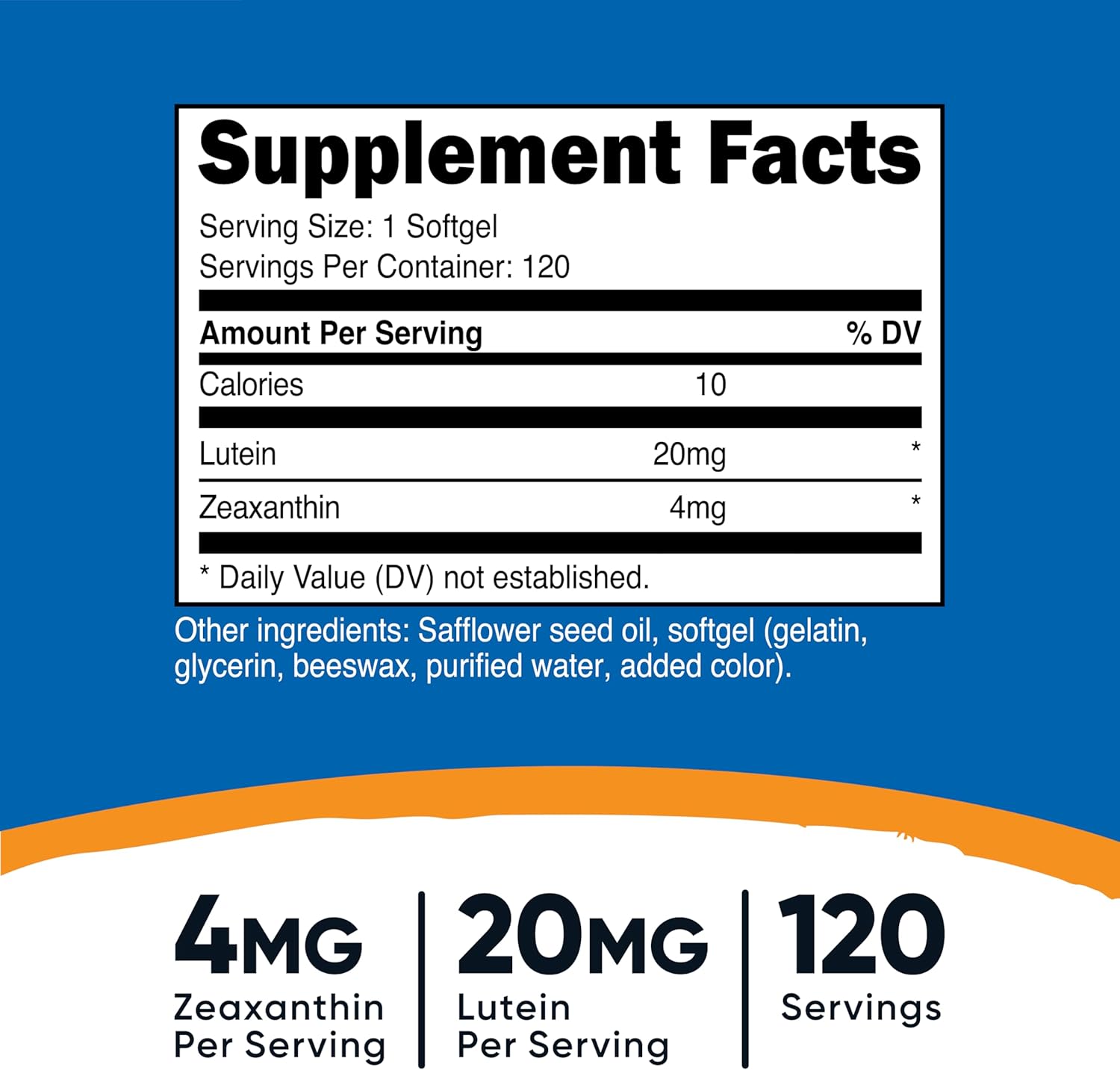 Nutricost’s Zeaxanthin with Lutein are high quality, non-gmo and gluten free. Each softgel contains 20mg of Lutein and 4mg of Zeaxanthin. All Nutricost products are made in a GMP compliant, FDA registered facility and undergo testing by independent (3rd party) ISO-accredited laboratories to insure you get the best products!
