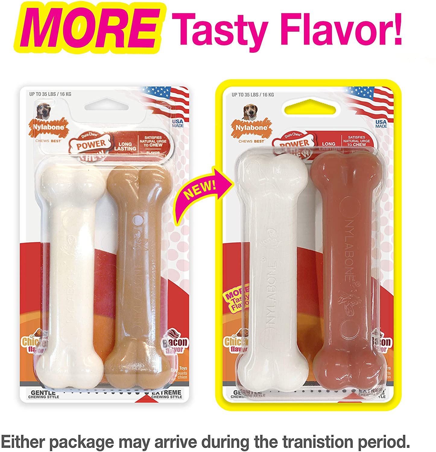 Double the flavor, double the chewing! Made with tough, durable nylon, these Power Chew Dog Chew Toys are the long lasting chew toys you need for your aggressive chewer. This value pack of power chews keeps dogs busy, satisfies their natural urge to chew, and encourages positive chewing habits. Plus, the bristles raised during chewing promote clean teeth and help control plaque and tartar!