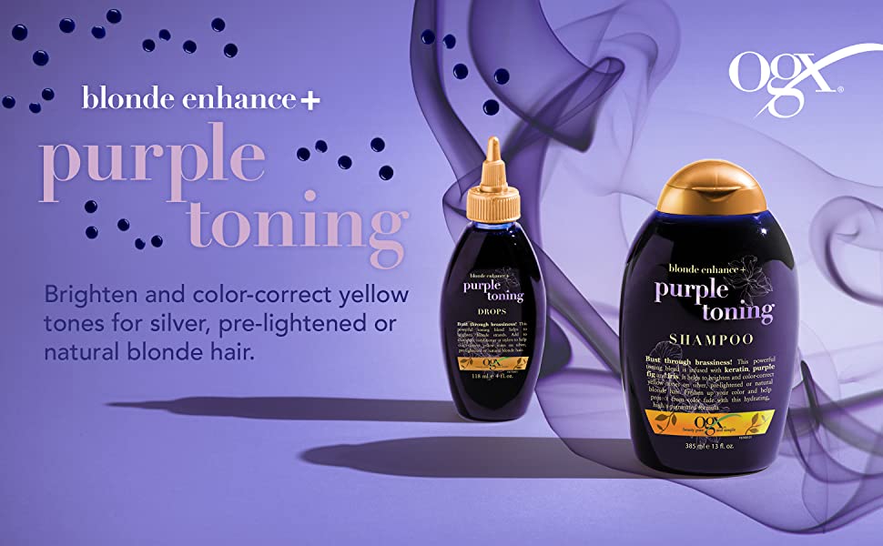 Say buh-bye to brass with OGX Blonde Enhance + Purple Toning Drops! This highly pigmented and potent dark purple liquid dispenses into drops to add to your favorite shampoo, conditioner and cream-based styling products. Use it to brighten and color-correct yellow tones on silver, pre-lightened or natural blonde hair with strengthening ingredients like keratin, purple fig and iris. Rinse out or leave in. However you use these customizable drops, banish unwanted, brassy tones.