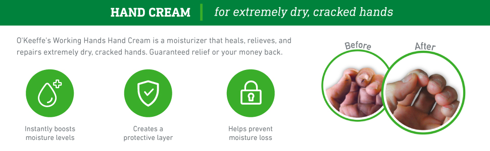 O’Keeffe’s Working Hands Hand Cream is a concentrated, unscented hand cream that heals, relieves and repairs extremely dry, cracked hands. When used daily, O’Keeffe’s Working Hands Hand Cream is clinically proven to instantly boost moisture levels, help prevent further moisture loss, create a protective barrier on the skin’s surface, and make a difference you will feel within days. O’Keeffe’s offers a tube version of our moisturizing hand cream. Our tube formula offers the same results O’Keeffe’s jar users know and expect in the convenience of a tube! Whether you prefer a tube or jar, O’Keeffe’s Working Hands Hand Cream comes in both forms to provide guaranteed relief.