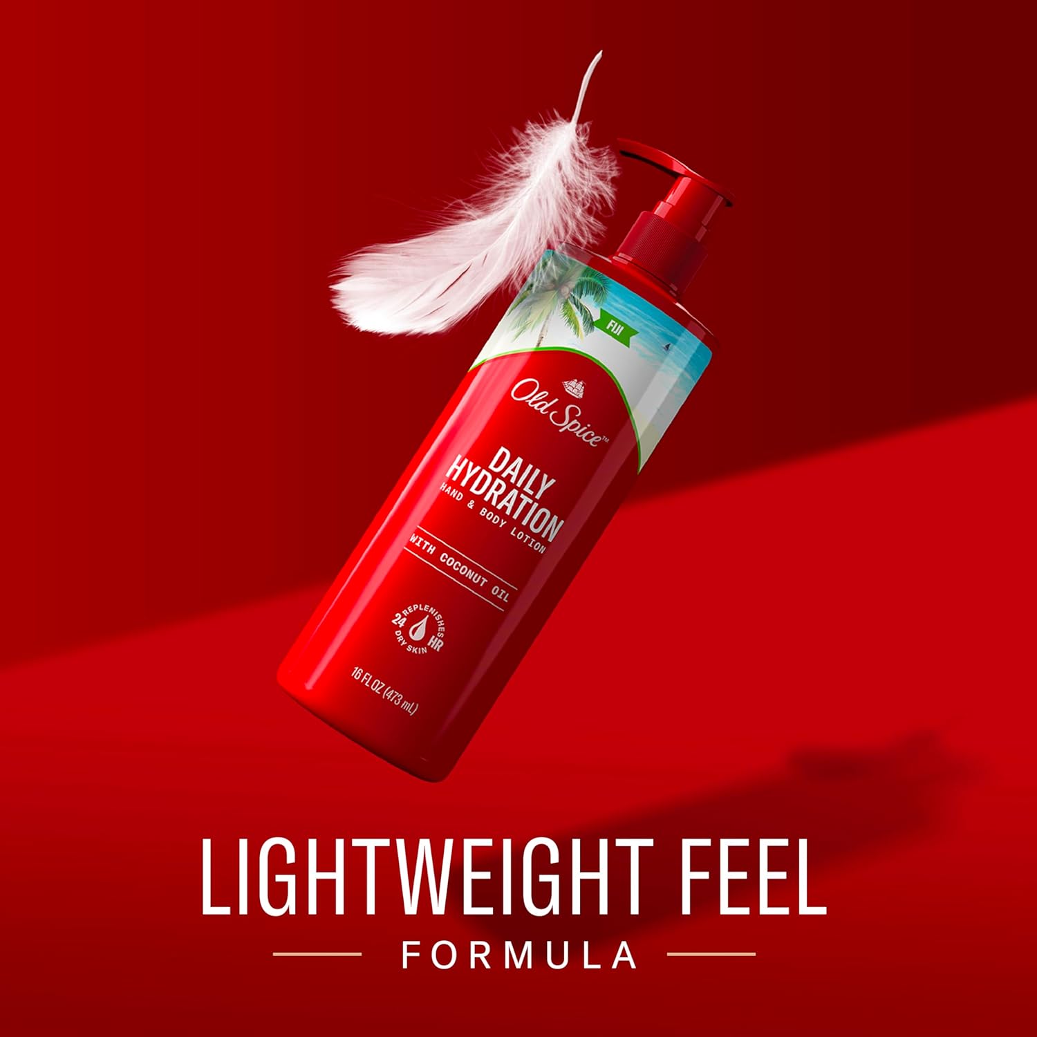 Here at Old Spice we take moisturization seriously and created a lightweight formula infused with Coconut Oil to deeply condition and provide all-day skin hydration. The Moisture, RICH. The Scent, RICH. Your Skin, RICH. Old Spice Daily Hydration Hand & Body Lotion lets you say sayonara to irritating dry skin with this all-over daily moisturizer. Application is easy-hand, lotion, pump, apply liberally on skin as needed. This is a modern scent for men that smells like coconut and lime. Moisture, CHECK. Hydration, CHECK. Take care of your skin with Old Spice Daily Hydration Hand & Body Lotion, the lotion your skin needs whether you want to admit it or not.