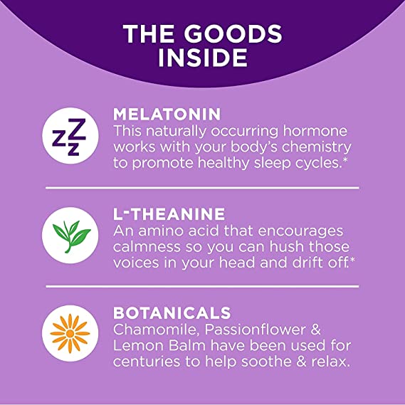 - THE GOODS INSIDE: Effective sleep blend features 3mg of Melatonin, a naturally occurring hormone that works with your body's chemistry. L-Theanine supports calmness and Botanicals like Chamomile, Passionflower & Lemon Balm to help soothe and relax*