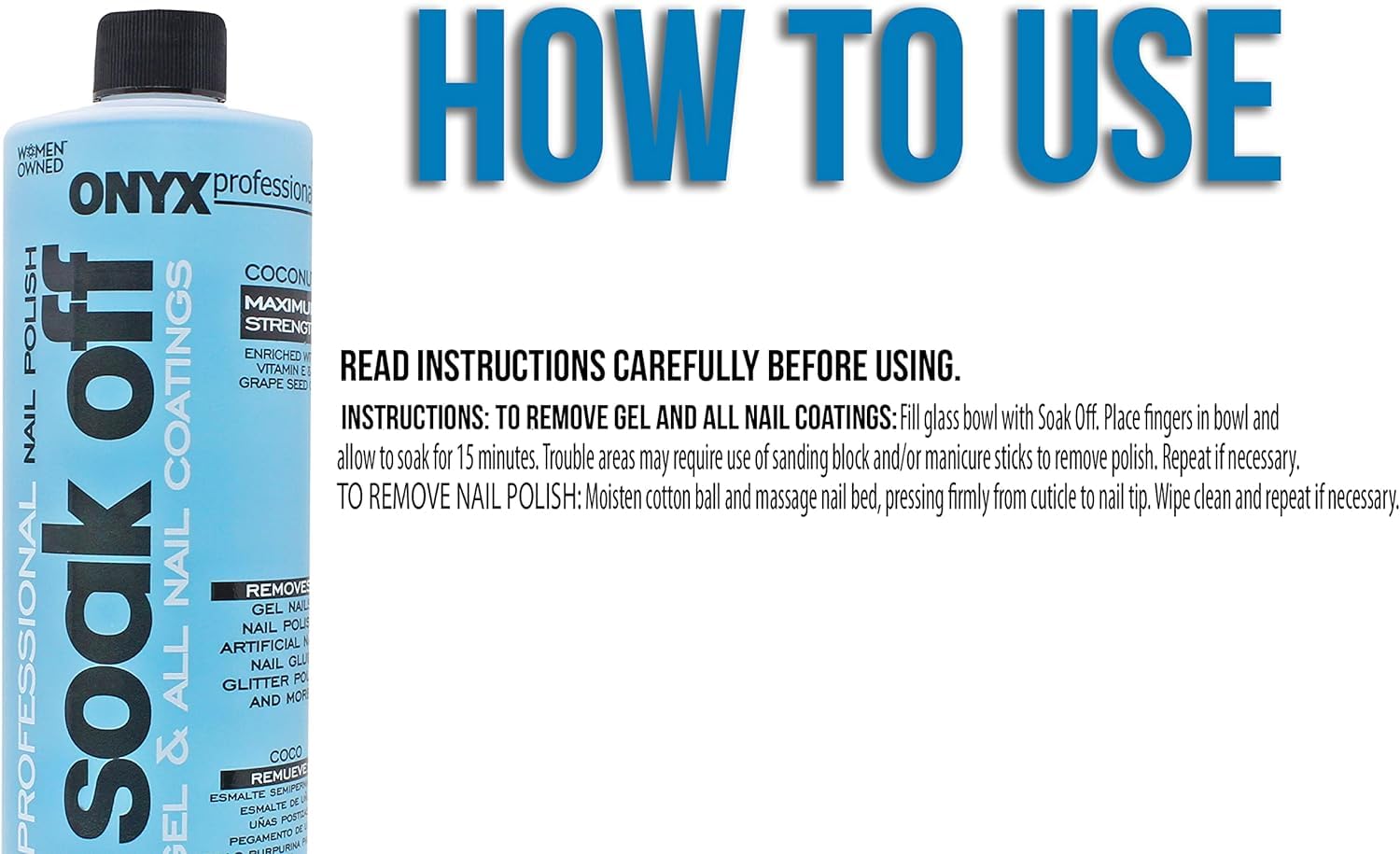 Introducing Onyx Professional's Efficient Nail Polish Removal Set, your all-in-one solution for quick and effortless nail polish removal. This set includes a soak-off nail polish remover, accompanied by a convenient nail filer, providing everything you need for a seamless nail care routine. Clean, Healthy Nails The soak-off polish remover is a powerful formula that swiftly eliminates gel nails, shellac polish, artificial nails, nail glue, glitter polish, and more. Its maximum strength ensures efficient results, while the pleasant coconut scent adds a delightful touch to your nail care experience. Enriched with Vitamin E and grape seed oil, this remover not only takes care of polish removal but also nourishes and conditions your nails, promoting their health and strength. Directions To remove gel or shellac polish, soak your fingers in a glass bowl filled with the remover for just 15 minutes. For regular nail polish removal, moisten cotton balls with the solution and gently massage your nails. Invest in the efficient nail polish removal set from Onyx Professional and enjoy salon-quality nail supplies in the comfort of your home. Simplify your beauty routine and achieve flawless nails with this exceptional product, designed to save you time and effort while pampering your nails.