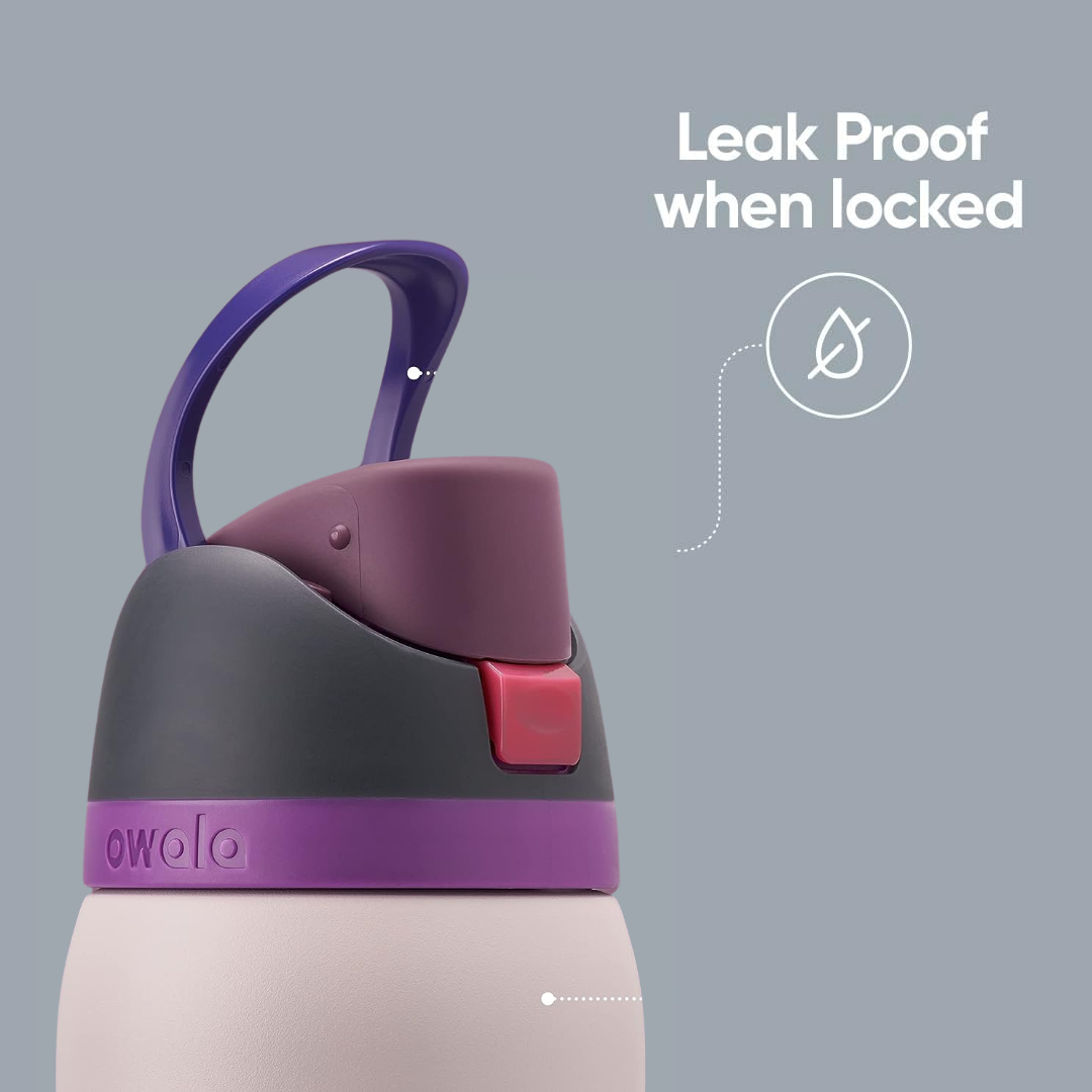 The Owala FreeSip Insulated Stainless-Steel Water Bottle with Locking Push-Button Lid easily tackles every thirst. With a built-in, easy-clean straw and a wide-mouth opening, the FreeSip reusable bottle is designed for drinking two different ways: sipping upright through the straw or tilting back to swig from the wide-mouth spout opening. Add in a push-to-open lid and playful colors, and staying hydrated has never been simpler—or more fun. Additional features include double-wall insulated stainless steel that keeps drinks cold up to 24 hours, a carry loop that doubles as a lock, and a wide opening for easy cleaning and adding ice. The Owala FreeSip Insulated Stainless-Steel Water Bottle with Locking Push-Button Lid is available in three sizes: 24-Ounce, 32-Ounce, and 40-Ounce. Lid is dishwasher safe; hand wash cup. Not for use with hot liquids. Manufacturer’s limited lifetime warranty.