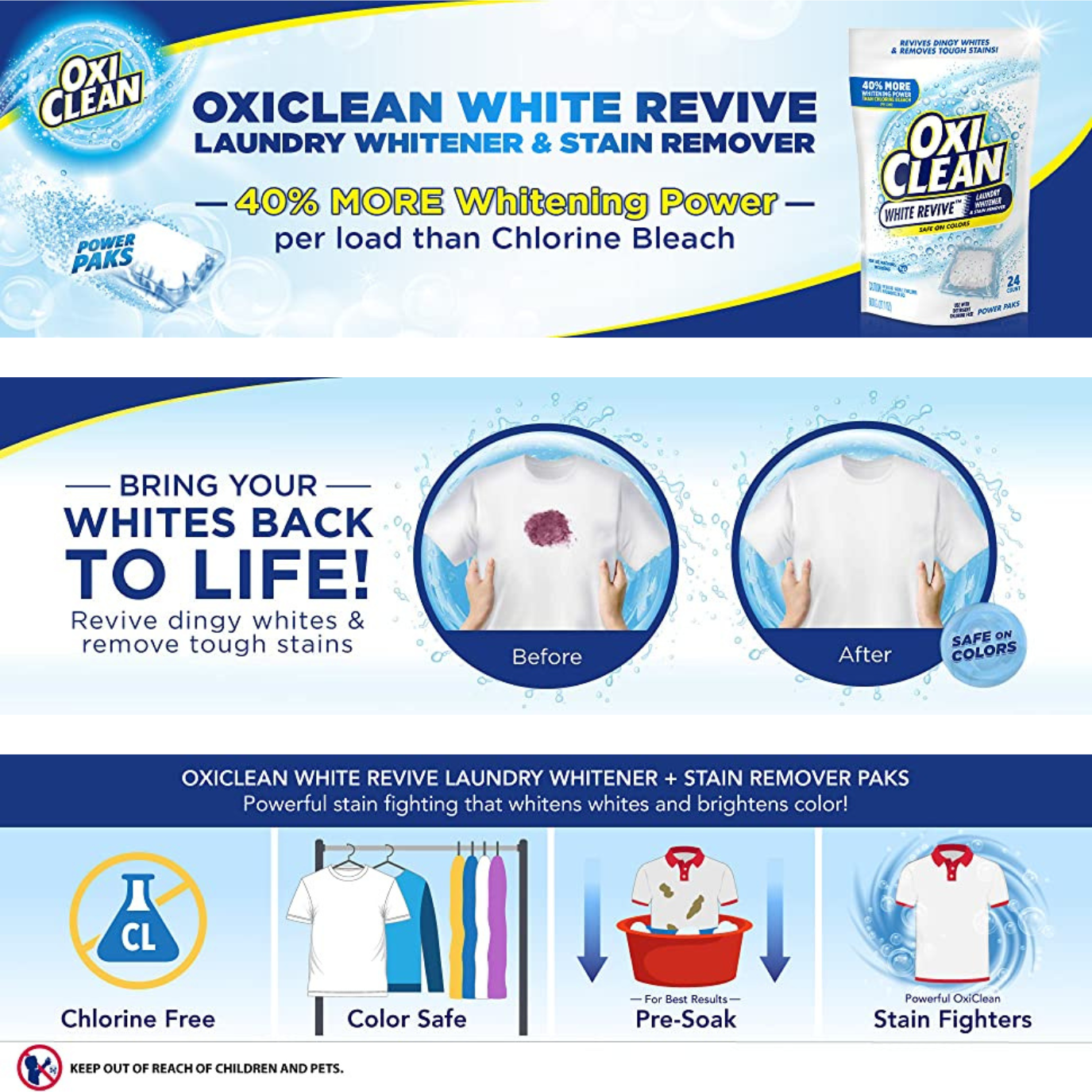 OxiClean White Revive Laundry Whitener & Stain Remover Power Paks give your whites a new take on life! With 40% more whitening power per load than chlorine bleach, this detergent booster is the perfect alternative for removing stains and keeping your white clothes bright without chlorine bleach. Power Paks make adding OxiClean White Revive to your laundry a breeze with no need to measure before adding it to each load. OxiClean White Revive Laundry Booster is a chlorine free stain remover, so it doesn't have the same harsh smell as chlorine bleach and avoids any risk of chlorine spills or splatters on colors. Plus, this OxiClean fabric whitener is color safe to help maintain and revive dingy whites. Add a pak of OxiClean White Revive Laundry Whitener, along with your regular detergent, to every load of laundry, or dissolve a pak in water to pre-soak to help remove even the toughest stains. Great for linens, uniforms, shirts, socks and anything else that needs to be sparkling white, this stain remover helps to remove stains and brighten and restore dingy whites so they look newer for longer. OxiClean offers a wide array of products to fit all your stain removal needs. The OxiClean family has grown to include stain removers, pretreaters, laundry sanitizers, and much more!