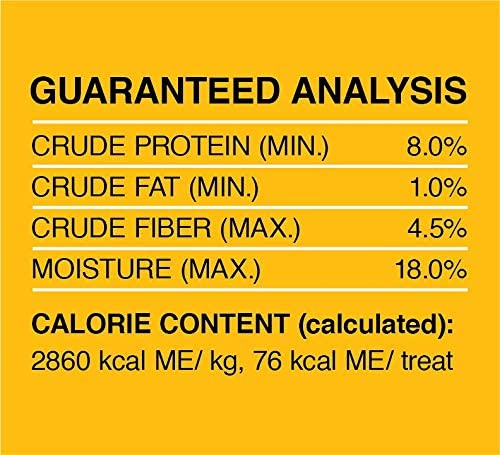 Feeding Guide: Weight of Adult Dog/Pieces per Day: (5 to 10 lbs/1 to 2), (10 to 25 lbs/2 to 5), (25 to 50 lbs/5 to 8), (50 to 75 lbs/8 to 11), (75 to 100 lbs/11 to 14). Not suitable for puppies or dogs under 5 lbs. Always keep fresh drinking water available.