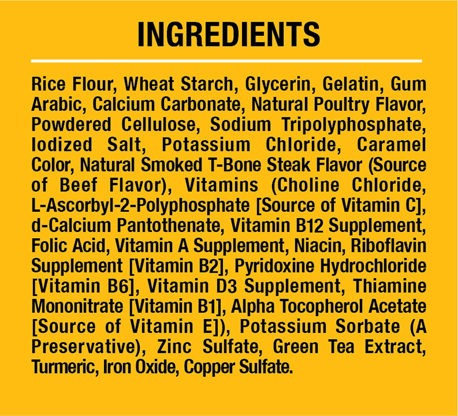 Rice Flour, Wheat Starch, Glycerin, Gelatin, Gum Arabic, Calcium Carbonate, Natural Poultry Flavor, Powdered Cellulose, Sodium Tripolyphosphate, Iodized Salt, Potassium Chloride, Caramel Color, Vitamins (Choline Chloride, L-Ascorbyl-2-Polyphosphate [Source of Vitamin C], d-Calcium Pantothenate, Vitamin B12 Supplement, Vitamin A Supplement, Niacin, Riboflavin Supplement [Vitamin B2], Pyridoxine Hydrochloride [Vitamin B6], Vitamin D3 Supplement, Thiamine Mononitrate [Vitamin B1], Folic Acid, Alpha Tocopherol Acetate [Source of Vitamin E]), Natural T-Bone Steak Flavor (Source of Beef Flavor), Smoke Flavor, Potassium Sorbate (A Preservative), Zinc Sulfate, Green Tea Extract, Turmeric, Iron Oxide Color, Copper Sulfate.