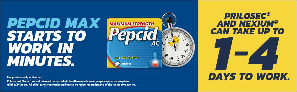 Maximum Strength Pepcid AC Heartburn Relief Tablets with famotidine provide fast-acting prevention and relief of heartburn associated with acid indigestion and sour stomach. Each acid controlling tablet contains 20 mg of famotidine, a known acid reducer that helps relieve heartburn brought on by eating or drinking certain food and beverages. Keep a package in your bag or at your desk for easy-access to treat heartburn on-the-go. You can take Maximum Strength Pepcid AC as little as 10 minutes before eating, and know you have strength on your side all day or all night.** *Prevents heartburn if taken 10 to 60 minutes before a meal. **Based on 9-hour acid control studies during the day and 12-hour acid control studies during the night. Acid control does not imply symptom relief.