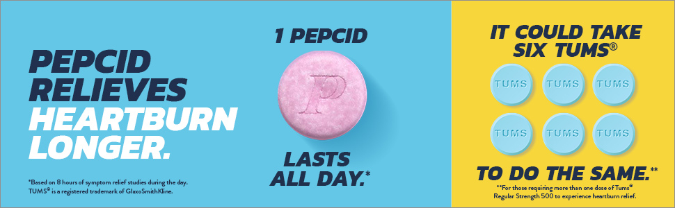 Pepcid AC Original Strength Heartburn Relief Tablets with famotidine provide fast-acting prevention and relief of heartburn associated with acid indigestion and sour stomach. Each acid controlling tablet contains 10 milligrams of famotidine, a known acid reducer that helps relieve heartburn brought on by eating or drinking certain food and beverages. Keep a package in your bag or at your desk for easy-access to treat heartburn on-the-go. You can take Original Strength Pepcid AC as little as 15 minutes before eating, and know you have strength on your side all day or all night.** It can calm the acid flare-up with relief that starts working in minutes.*** * Prevents heartburn if taken 15 to 60 minutes before a meal. ** Based on 9-hour acid control studies during the day and 12-hour acid control studies during the night. Acid control does not imply symptom relief. *** Pepcid AC starts to relieve heartburn in 15 to 30 minutes.