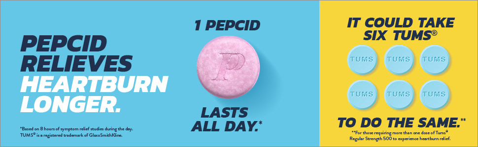 Pepcid tablets feature a powerful, fast-acting formula that helps to neutralize acid in seconds for immediate comfort. Additionally, they offer dual action by continuing to protect against heartburn for the next 8 hours, so there's no concern for heartburn creeping back up. Pepcid chewable tablets contain effective active ingredients for powerful relief. There's no need to dissolve tablets in water or swallow uncomfortable pills to take Pepcid Complete. This product comes in easy, chewable tablets, so you can take them without water at home, on the go or in the office. So you won't find yourself in a situation where you can't get heartburn relief. Enjoy impromptu meals out with friends or dinner parties without worry.