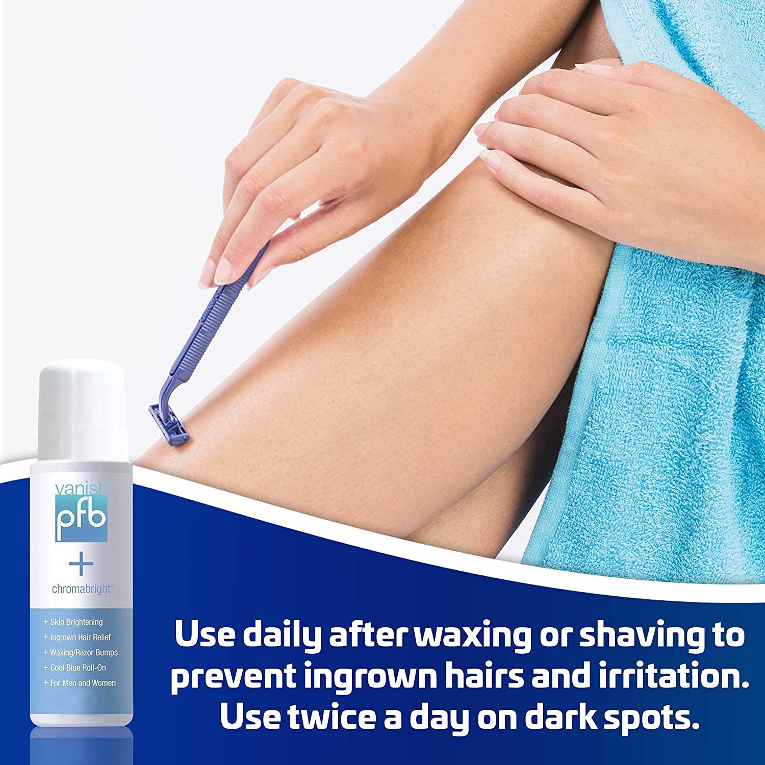 Use daily after waxing or shaving to prevent ingrown hairs and irritation. Use twice a day on dark spots.