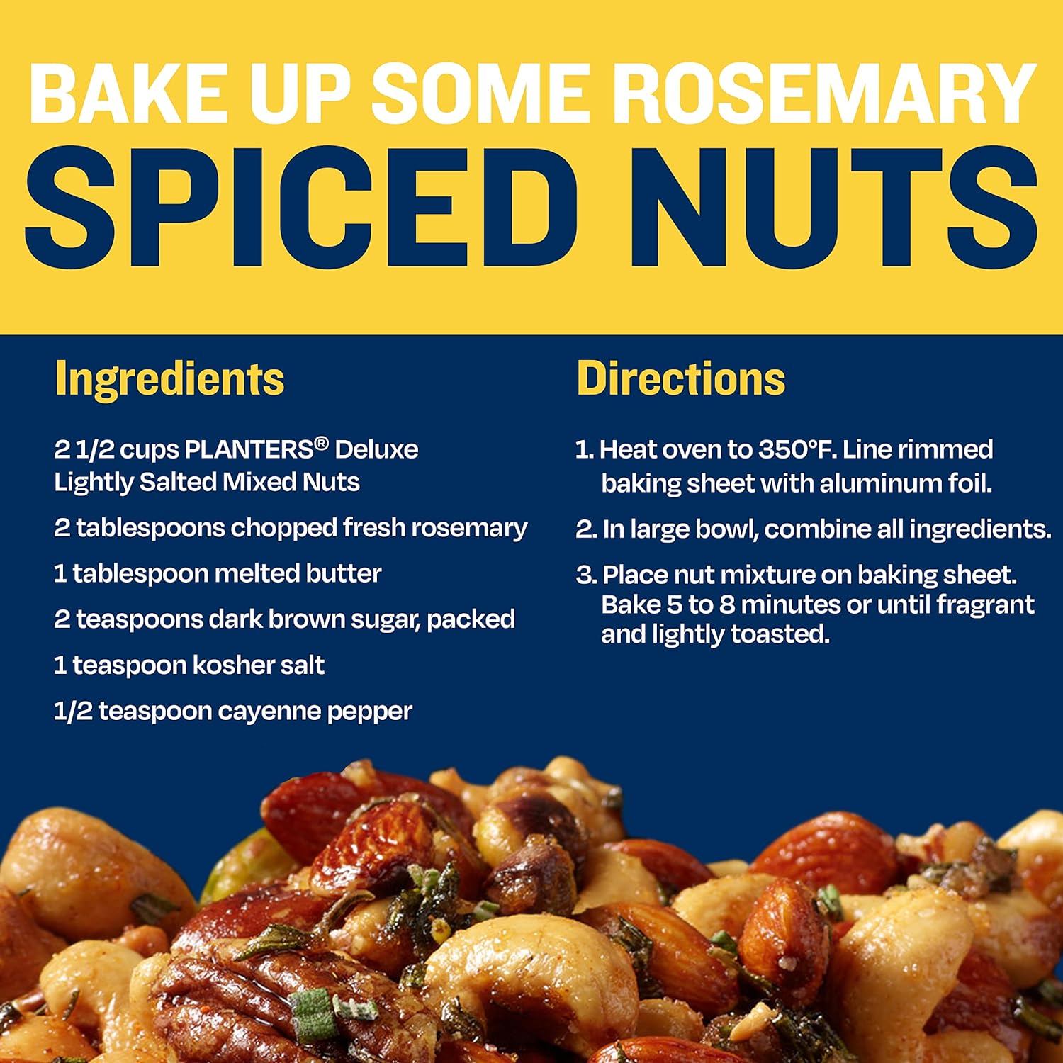 LANTERS Deluxe Lightly Salted Mixed Nuts deliver style and substance in every bite. This delicious blend contains peanuts (less than 50% of the mix), almonds, cashews, Brazil nuts and pecans. The mixed nuts are roasted in peanut oil and lightly salted for crave-worthy flavor with 50% less sodium per serving than PLANTERS Mixed Nuts. A classic guest at cocktail parties, family movie nights, and holiday get-togethers, the makers of PLANTERS peanuts have been serving up deliciousness. The combination of delicious flavors and crunchy textures in these mixed nuts satisfies on any occasion, whether you’re feeling fancy or not. Each 1oz Kosher serving contains 5 grams of plant-based protein and 170 calories to help curb your hunger and keep you going until mealtime.