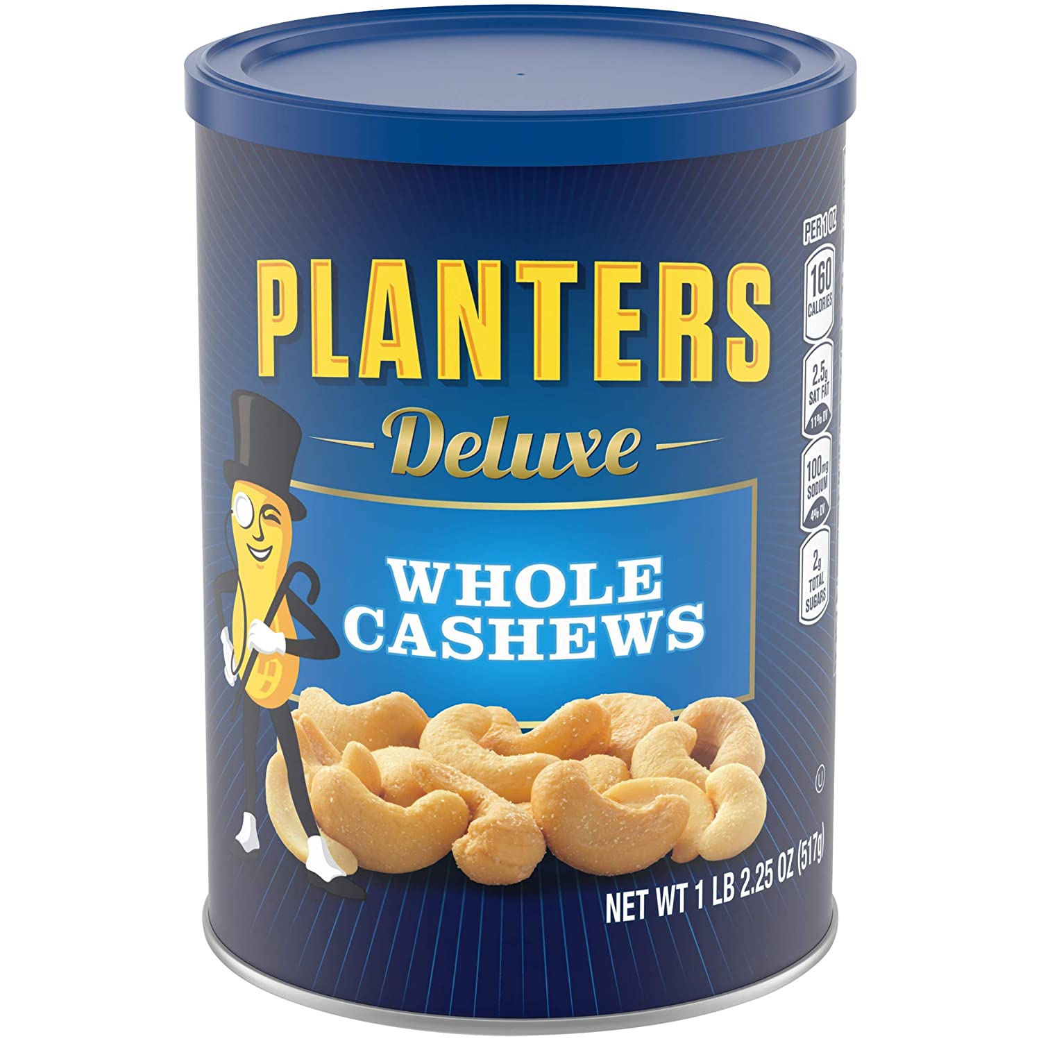 Planters Deluxe Whole Cashews deliver the rich flavor and crunchiness that makes you crave just one more handful.Roasted in peanut oil and finished with sea salt for great taste, these roasted cashews have an enjoyable crispy texture.A convenient on-the-go snack, these roasted nuts are also comforting when you want to relax at the end of a busy day.This 18.25 oz.canister of cashews is Kosher-friendly, sealed for freshness and has a fulfilling 160 calories per 1 oz.serving.These roasted cashews help curb hunger and give you an energy boost during a work break or after exercising.Indulge in these flavorful, crunchy nuts anytime you need a quick snack thats both nutritious and satisfying.