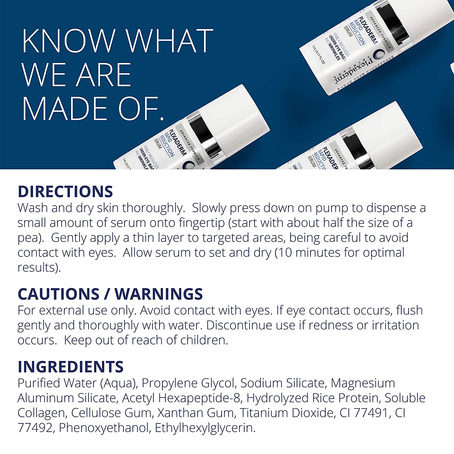 In less than 10 minutes, Plexaderm Rapid Reduction Serum - Advanced Formula reduces the appearance of under eye bags, wrinkles, dark circles, crow's feet, fine lines, smile, eleven and forehead lines.