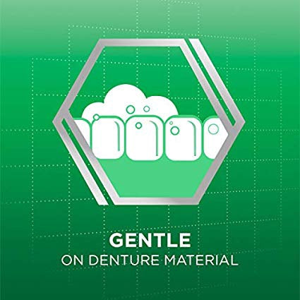 Cleanses denture material gently