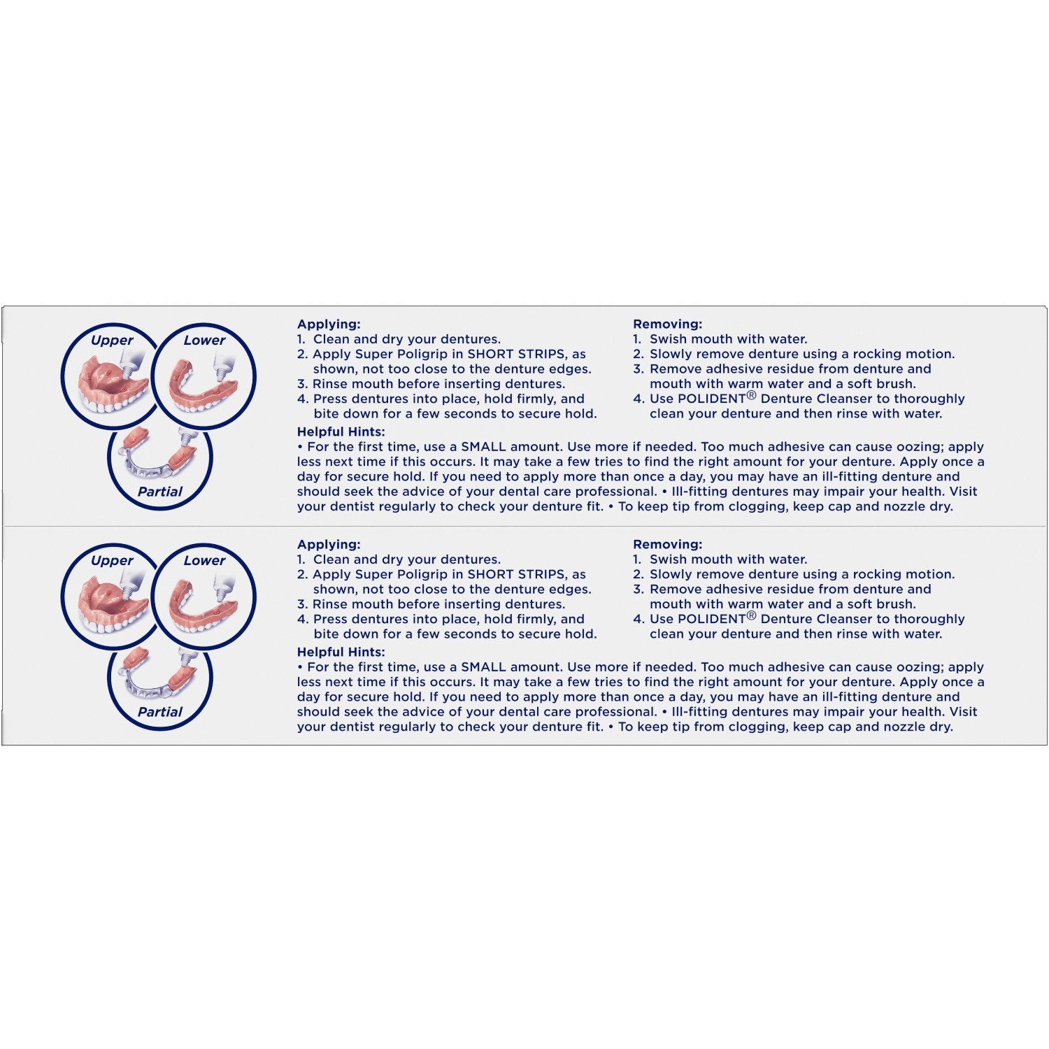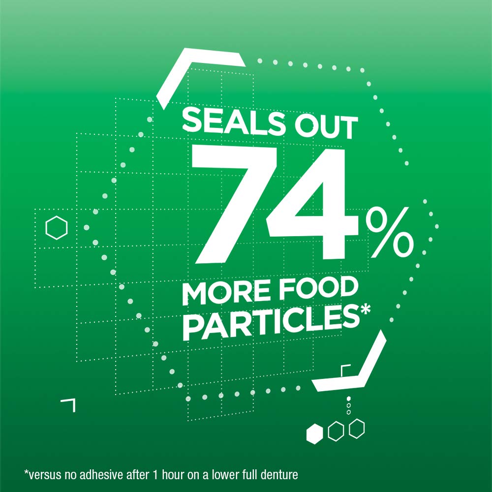 Super Poligrip Original Denture Adhesive Cream offers a strong 12-hour hold that seals out up to 74% more food particles. Its zinc-free formula is specially designed to give you a natural feel, so you can seal and protect with confidence throughout the day. Plus, all Super Poligrip Denture Adhesive products help prevent gum irritation by keeping out food particles, giving you comfort you can count on with every use. No matter what type of denture adhesive you re looking for, Super Poligrip has your solution. Super Poligrip Denture Adhesive comes in a variety of formats including Free, Extra Care, Ultra Fresh, Extra Strength Adhesive Powder, and Comfort Seal Strips. Find the Super Poligrip product best for you to maintain good oral health and feel secure about your smile every day. And for all your denture cleaning needs, try Polident to kill 99.99% of odor-causing bacteria. versus no adhesive after 1 hour on a lower full denture soaking only, in laboratory tests.
