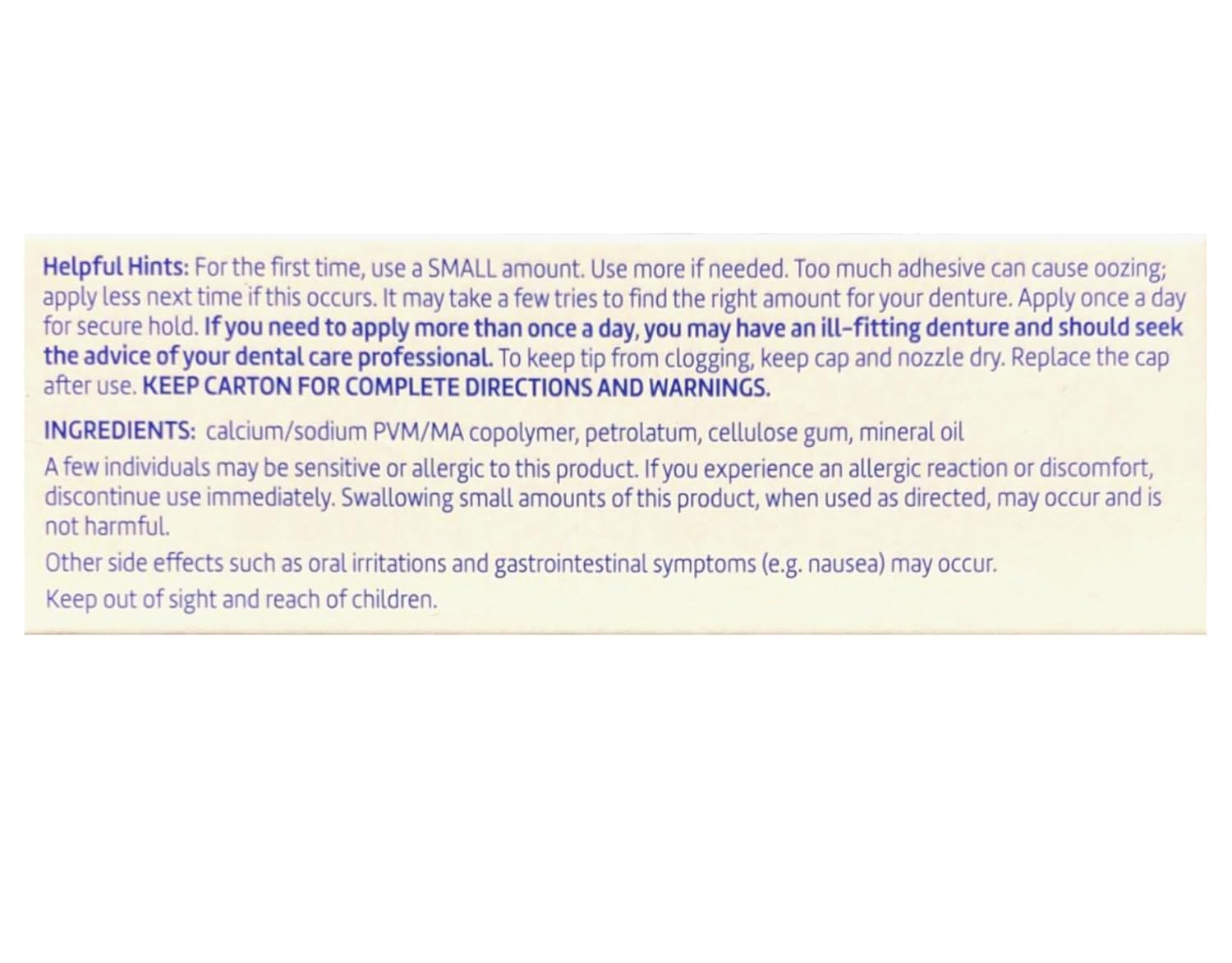 Even well-fitting dentures are susceptible to food particles that can cause discomfort. Just 2-3 pea-size amounts of Super Poligrip are clinically proven to seal out more food particles than no adhesive so you can savor every bite. Super Poligrip Free is formulated to give you an all-day hold without artificial colors or flavors.