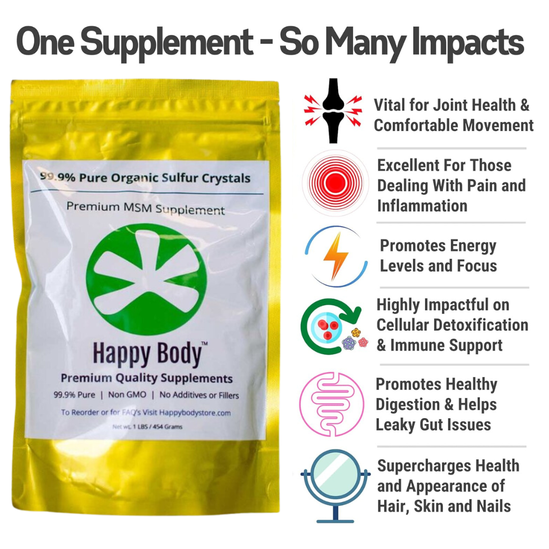 Happy Body Organic Sulfur Is Pure, High Performance MSM Crystals.