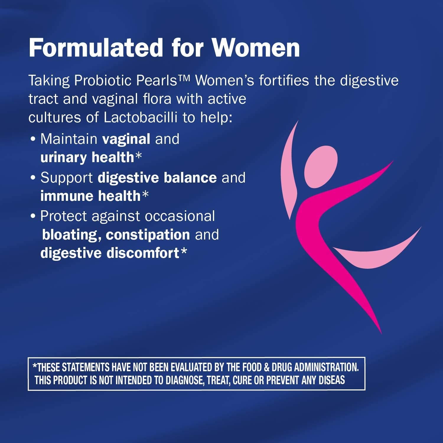 - FORTIFY THE DIGESTIVE TRACT AND VAGINAL FLORA: Taking Probiotic Pearls Women's fortifies the digestive tract and vaginal flora with active cultures of L. acidophilus, L. rhamnosus and L. plantarum to help maintain yeast balance and vaginal health, support digestive balance and immune health and protect against occasional gas, bloating and constipation.*