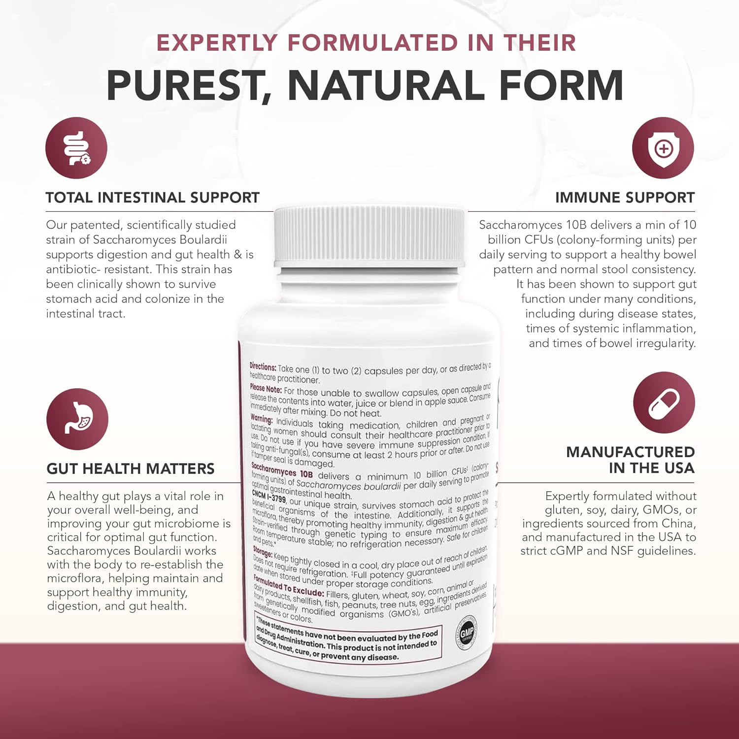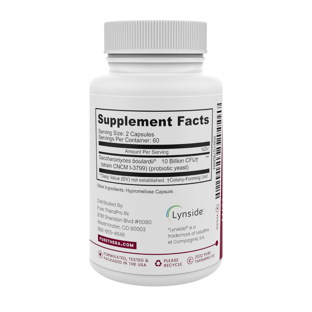 - SACCHAROMYCES BOULARDII PROBIOTIC: Saccharomyces is a patented & clinically studied strain that has been used for its regulatory effect on the intestinal flora, helping to maintain normal balance in the intestine.
