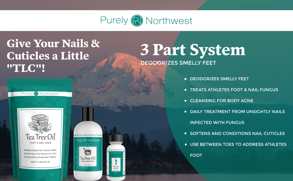 Purely Northwest Foot & Toenail Kit contains Tea Tree Oil Foot Soak, Tea Tree Oil Foot & Body Wash & Tea Tree Nail Blend