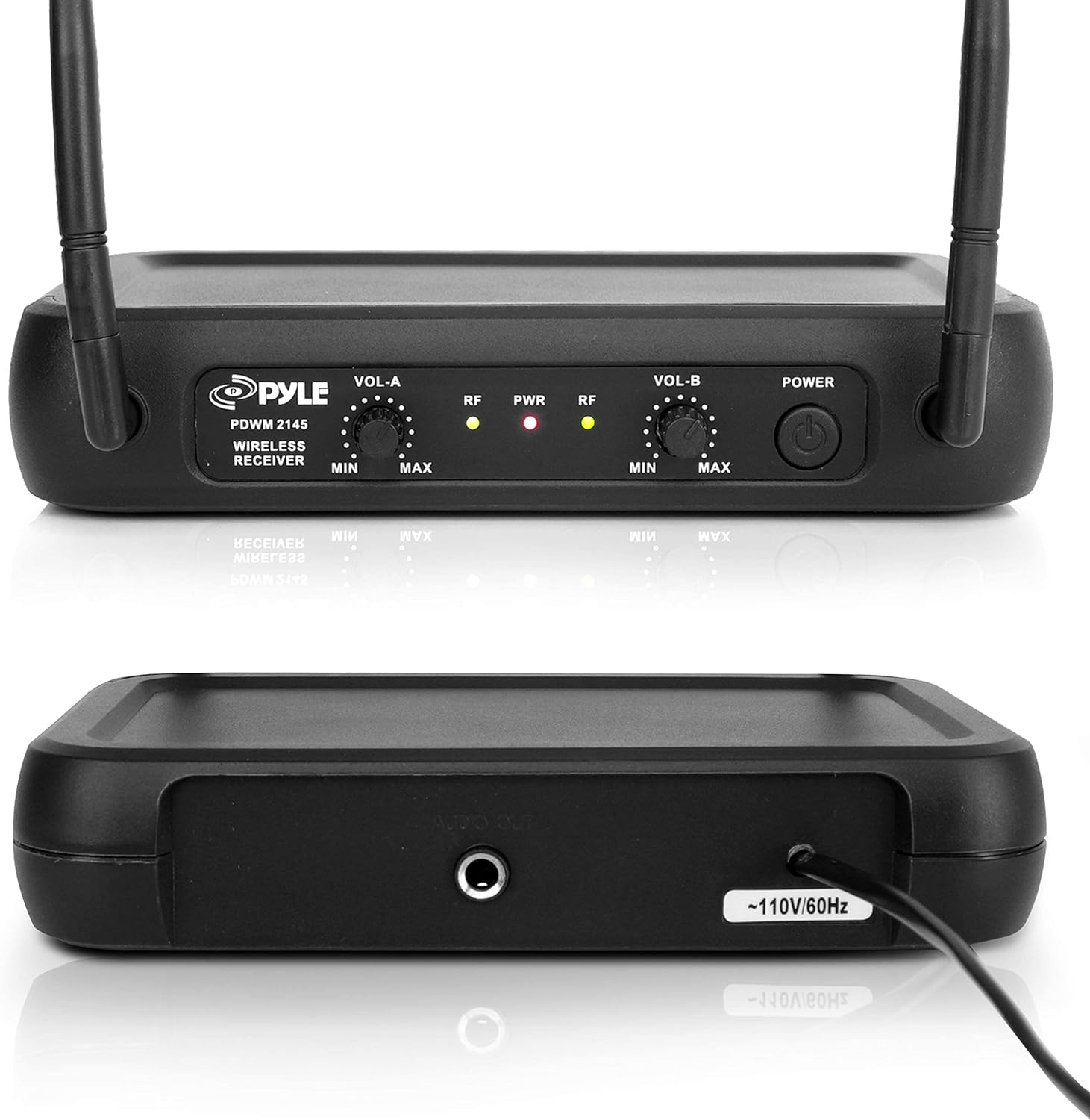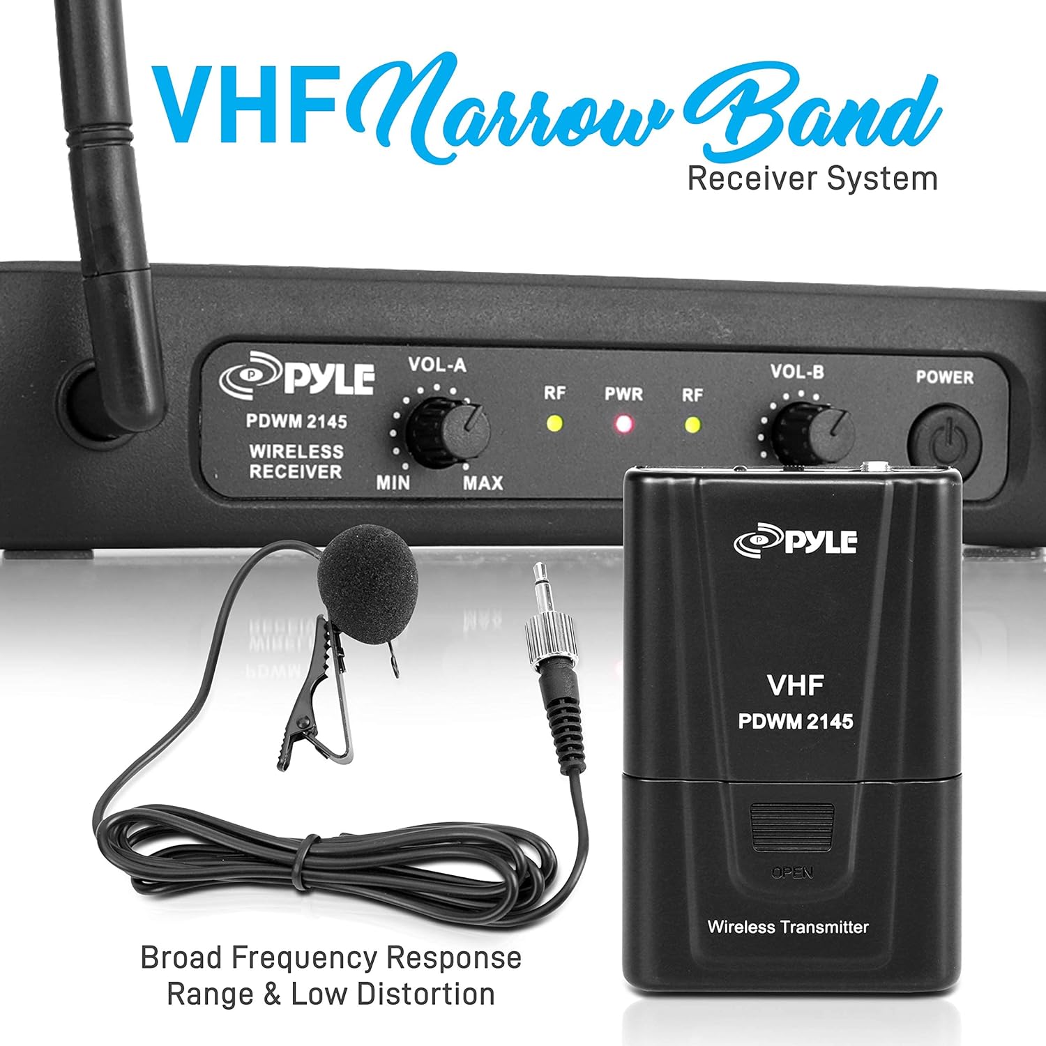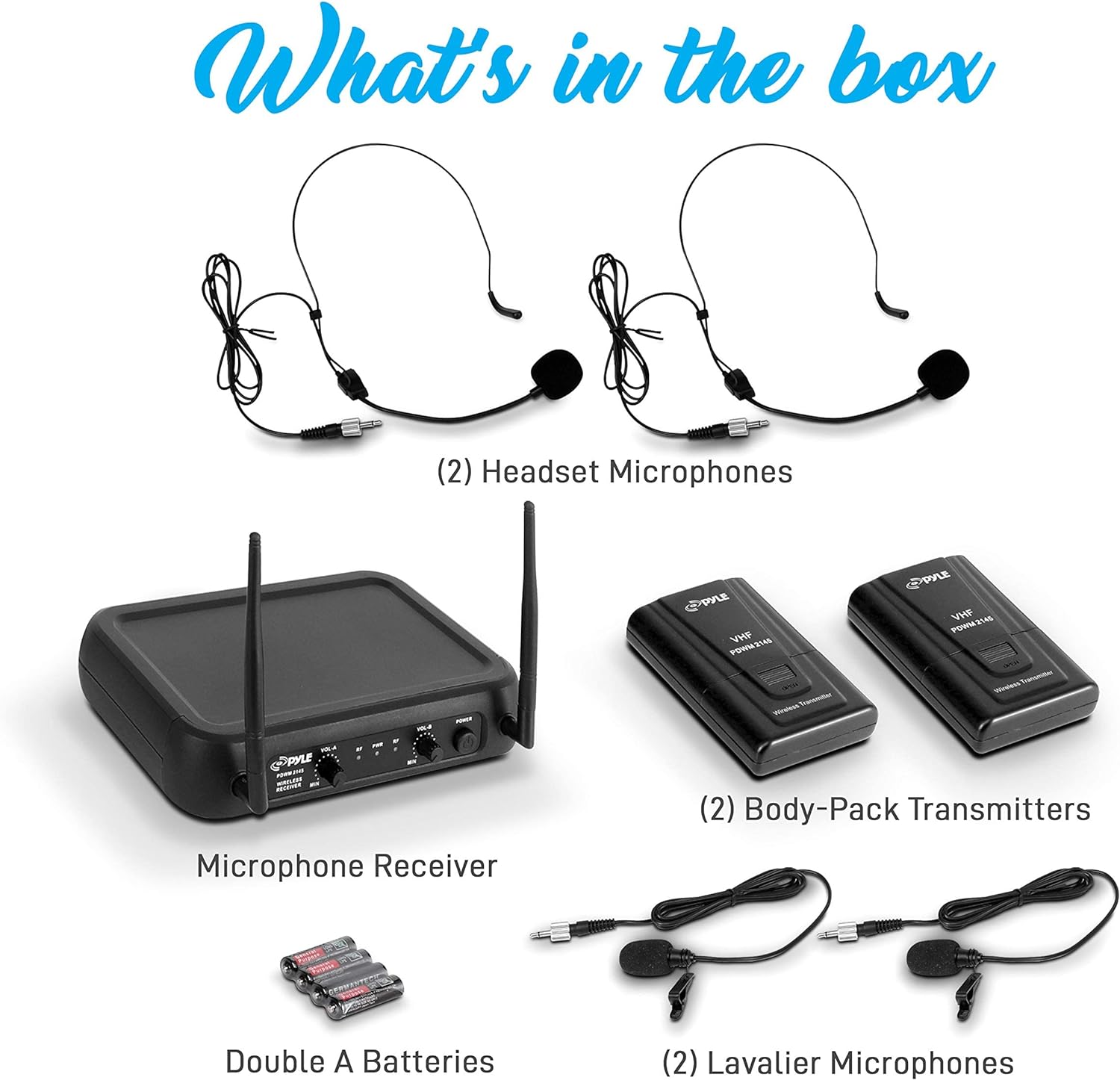Pyle Dual Channel Wireless Microphone System VHF Fixed Dual Frequency Wireless Mic Receiver This black wireless microphone system by Pyle Pro has dual frequency channel and broad audio response range with low distortion so you can enjoy cordless singing to karaoke music and mobility for energetic on stage performance. The package includes a receiver base, 2 lavalier and 2 headset microphone, 2 body pack transmitter, 1/4'' audio connection cable. The device can be used outdoor and indoor / personal home use