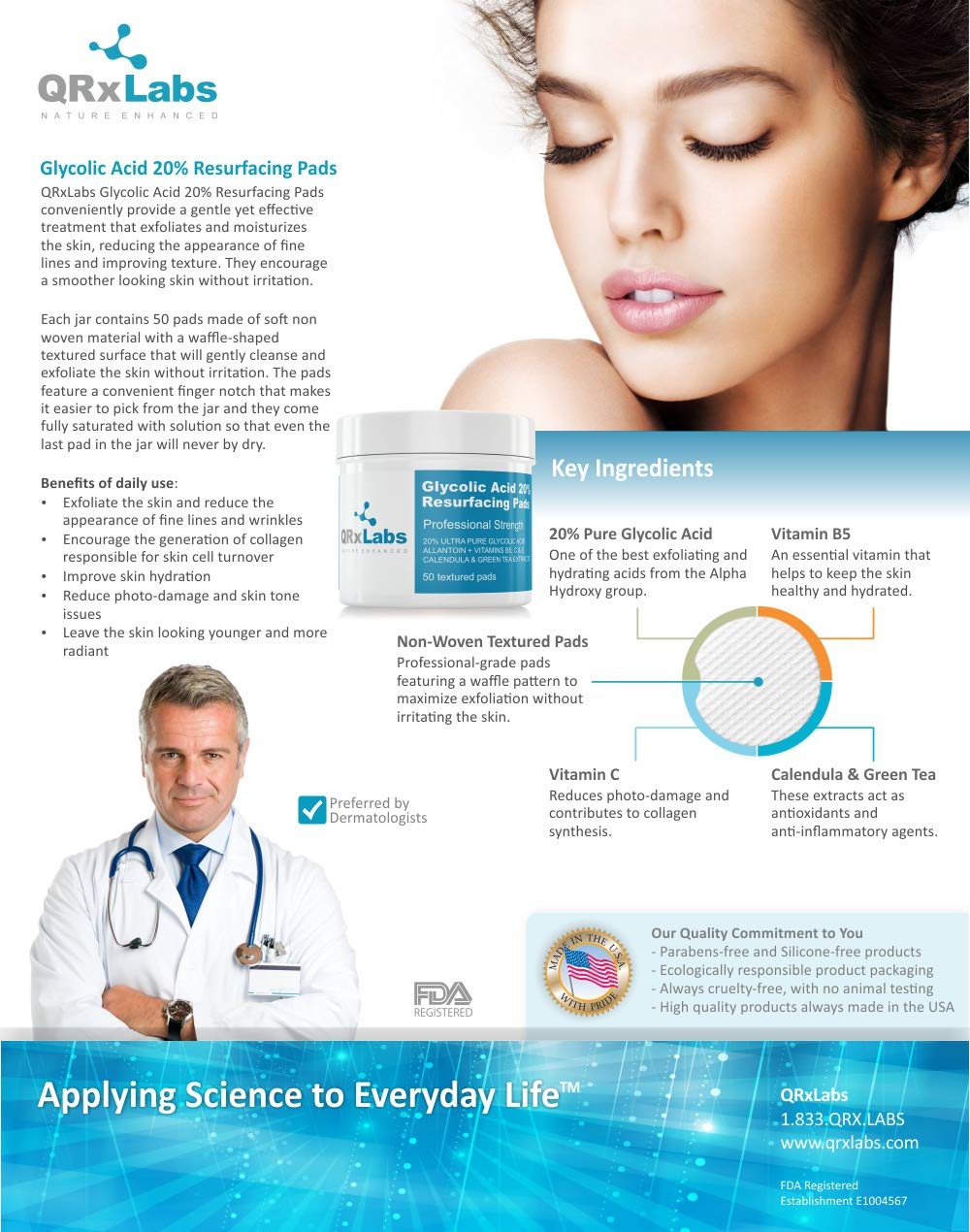 QRxLabs Glycolic Acid 20% Resurfacing Padscan be used daily or as directed by your dermatologist to exfoliate the skin and reduce the appearance of fine lines and wrinkles, encourage the regeneration of collagen responsible for skin cell turnover, improve skin hydration, reduce photo-damage or skin tone inconsistencies and leave the skin looking more youthful and radiant.