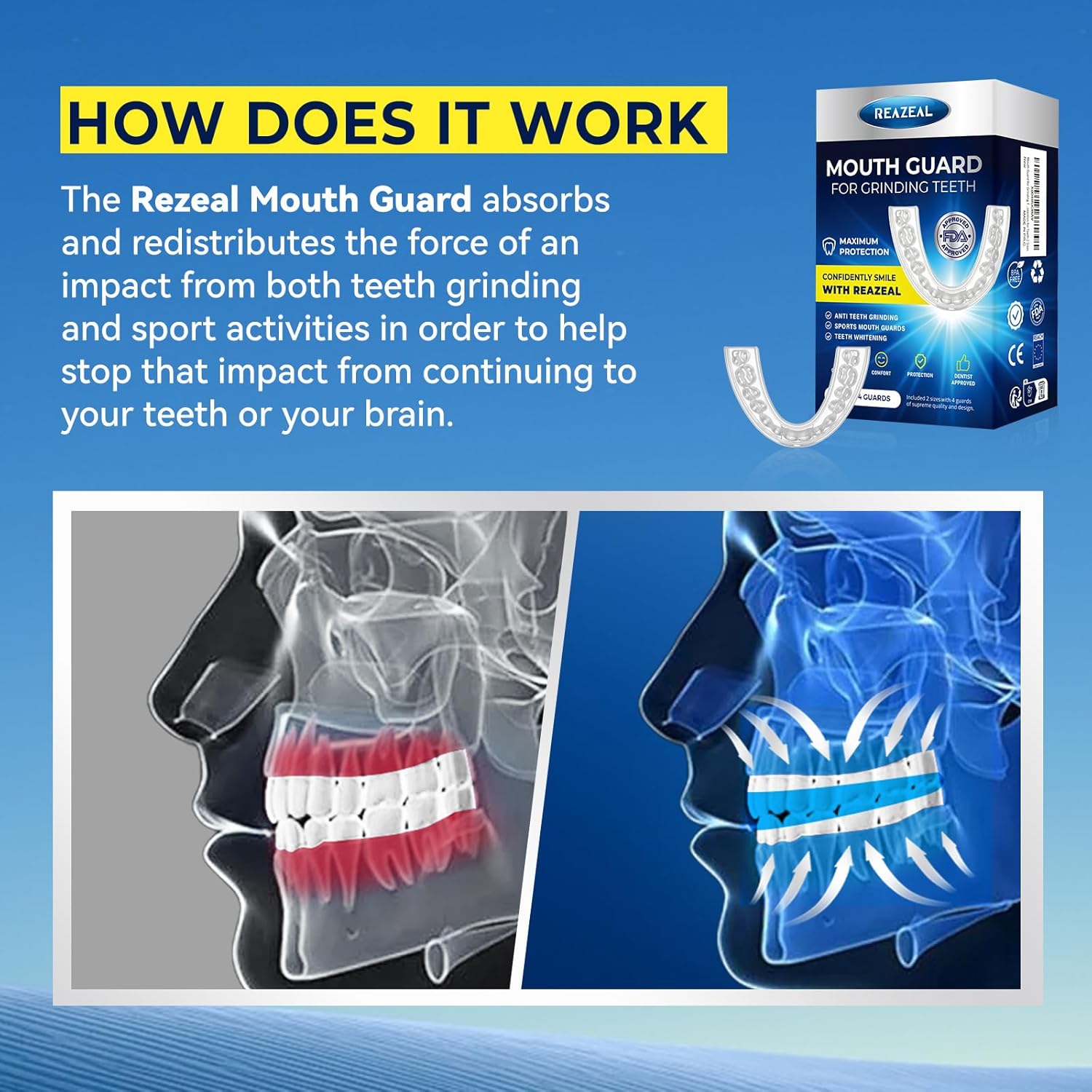 No matter what your teeth alignment is, no matter what the size of your mouth is, our guards will fit like a glove.