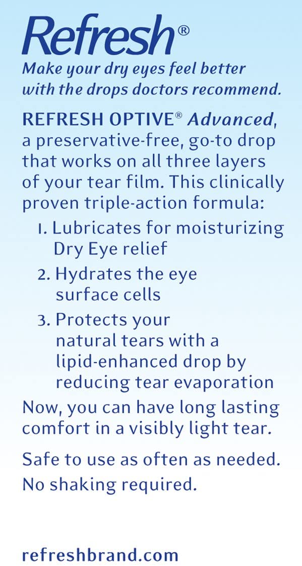 Refresh Optive Advanced Preservative-Free works on all three layers of the tear film to: 1. Lubricate for moisturizing Dry Eye relief; 2. Hydrate the eye’s surface cells; 3. Protect natural tears, helping reduce tear evaporation